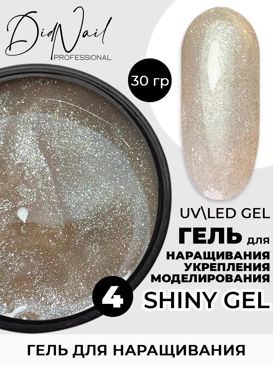 Гель для моделирования ногтей с блестками Shiny Gel от DidNail средней консистенции. Гель для наращивания и укрепления легко самовыравнивается и распределяется кистью, не затекает под кутикулу и боковые валики, не требует долгого опила. В составе геля блестки, которые придают маникюру легкое, нежное сияние и светоотражающий эффект. Это превосходное средство для создания идеального маникюра и педикюра. Благодаря своей уникальной формуле и высокому качеству полигель обеспечивает надежное и долговременное укрепление ногтевой пластины, идеально подходит для моделирования, укрепления ногтевой пластины, а также для наращивания ногтей. Сочетается в работе с любыми профессиональными материалами. Подходит как для новичков маникюра и педикюра, так и для профессионалов ногтевого сервиса. Гель для моделирования ногтей имеет полупрозрачную текстуру. Время полимеризации в УФ-лампе 36 Вт - 2 мин, в LED/UV лампах 48 Вт - 1 мин. После полимеризации имеет дисперсионный слой. Для наилучшего глянца рекомендуем закрепить топовым покрытием. Производство Россия.