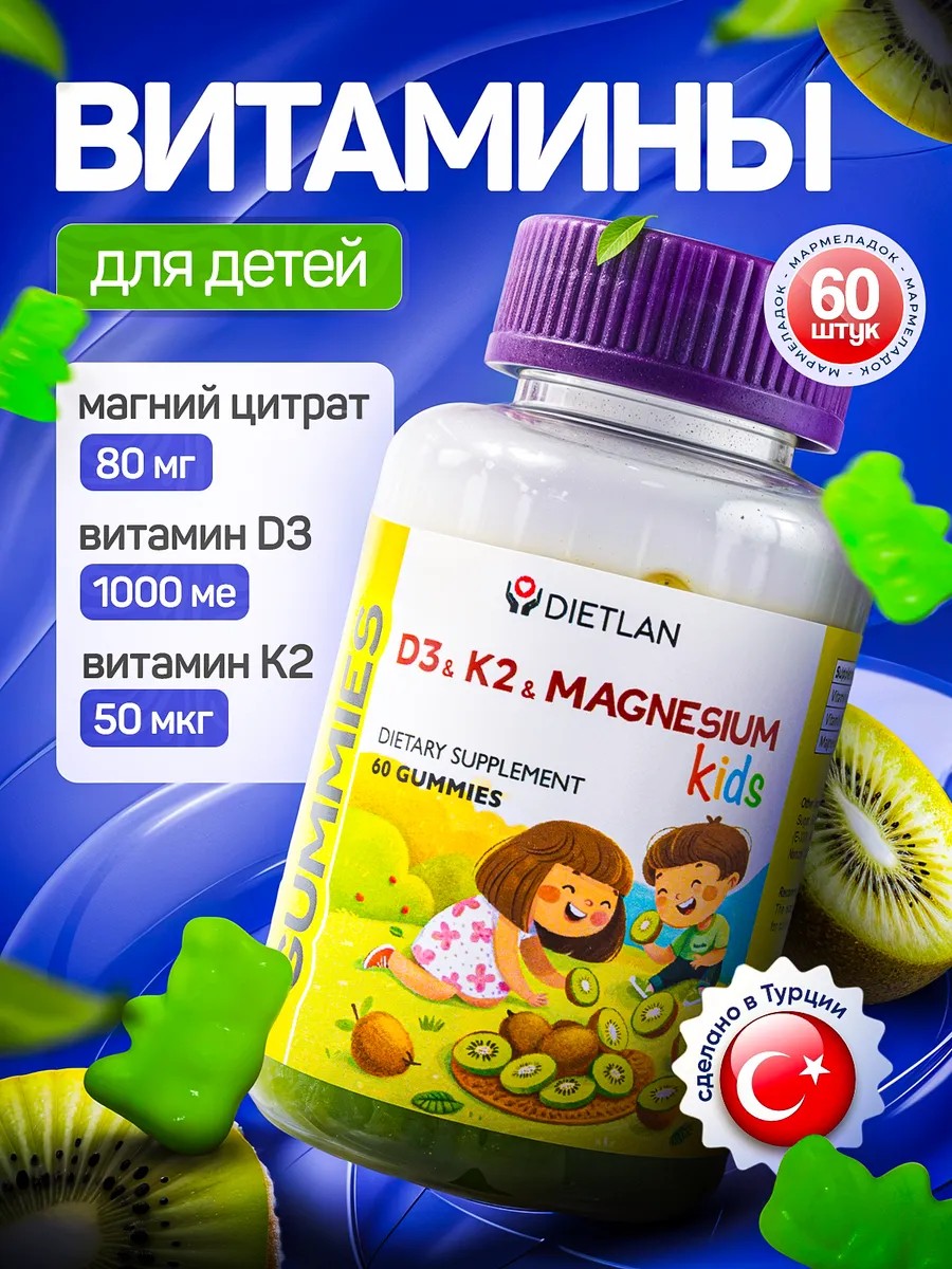 Витамины Д3 К2 Магний от турецкого бренда Dietlan — комплексная поддержка детского здоровья в удобной форме вкусных мармеладок. Рекомендованы детям от 4х лет. D3 играет ключевую роль в усвоении кальция и фосфора, способствуя укреплению костей и зубов. Он также поддерживает иммунную систему, повышая защитные функции организма. K2 отвечает за правильное распределение кальция в организме, предотвращая его отложение в мягких тканях и сосудах, что способствует здоровью сердца и сосудов. Магнезиум (mg) — незаменимый минерал, участвующий в более чем 300 биохимических реакциях. Он помогает снизить уровень стресса, улучшает качество сна, поддерживает нормальную работу мышц и нервной системы. Форма выпуска — жевательные мишки, которые дети с удовольствием принимают. Продукт произведён в Турции, не содержит глютен, лактозу и искусственные красители. Подарите ребёнку здоровье с натуральным витаминным комплексом Dietlan! В нашем магазине также можно приобрести витамины других фирм, таких как Orzax Ocean (Орзакс Океан) и Shiffa Home.