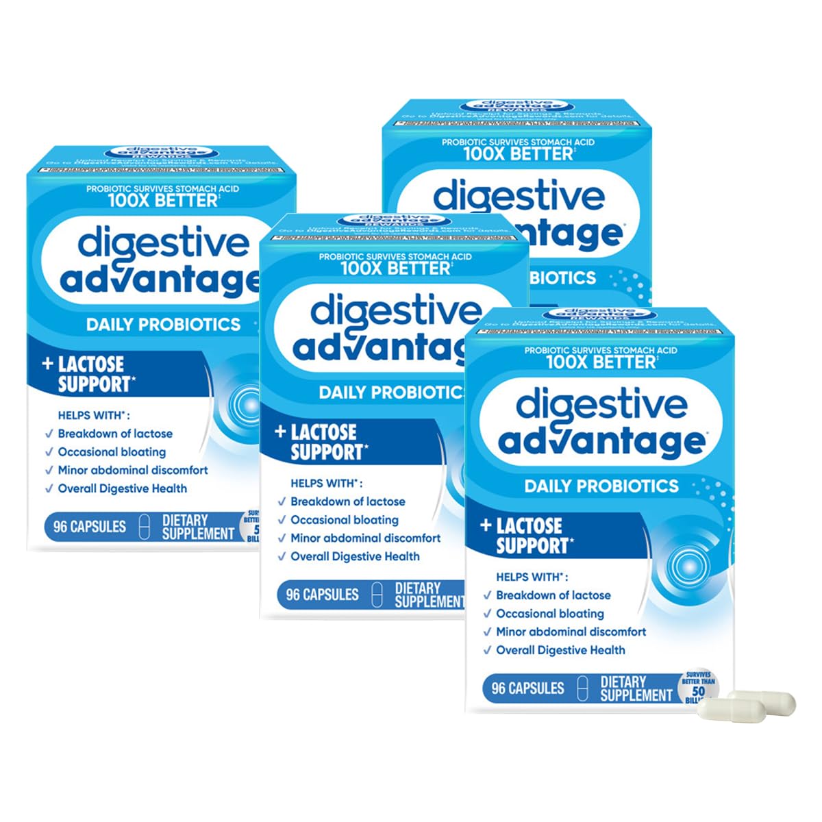 PROBIOTIC DIGESTIVE ENZYMES FOR WOMEN MEN: Digestive Advantage Daily Probiotics for women men Lactase Enzymes are crafted to help support your digestive health and immune health. LACTOSE PILLS: Our Daily Probiotic capsules Lactose Support help with breakdown of lactose, immune support, occasional bloating, and minor abdominal discomfort. ONE-HUNDRED TIMES BETTER: 2 Billion CFUs of patented BC-30 probiotics survives stomach acid 100X BETTER vs. yogurt BETTER THAN 50 BILLION: Our BC-30 Probiotics survive better than products offering 50 Billion live cultures. IMMUNITY: 70 of your immune system is in your digestive tract. The good bacteria in Digestive Advantage Daily Probiotics helps support the immune cells in your gut. LACTASE PILLS: When your body lacks enough lactase enzymes, dairy digest gets tricky. Our lactase, dairy enzymes, help breakdown Lactose to help your digestion. PATENTED PROBIOTIC: It is protected with a natural protein shell to deliver more beneficial bacteria to your gut alive, to support your gut health. Our mens and womens probiotic support digestive balance. Digestive Advantage Daily Probiotic Lactose Support capsules are Non-GMO, No Dairy, Vegetarian, and are guaranteed for Purity, Freshness, Potency. THE INSIDE ADVANTAGE: Digestive Advantage prebiotic and probiotic fiber gummies, probiotic pills, probiotic gummies, and kids gummies are designed to target the source and support gut health for women and men. These statements have not been evaluated by the Food and Drug Administration. This product is not intended to diagnose, treat, cure or prevent any disease. Based on median survivability of Digestive Advantage Probiotic BC30 vs. yogurts in a simulated gastric environment.These statements have not been evaluated by the Food and Drug Administration. This product is not intended to diagnose, treat, cure or prevent any disease. THE INSIDE ADVANTAGE: Digestive Advantage prebiotic and probiotic fiber gummies, probiotic pills, probiotic gummies, and kids gummies are designed to target the source and support gut health for women and men. Digestive Advantage Daily Probiotic Lactose Support capsules are Non-GMO, Non-Dairy, Vegetarian, and are guaranteed for Purity, Freshness, Potency. PATENTED PROBIOTIC: It is protected with a natural protein shell to deliver more beneficial bacteria to your gut alive, to support your gut health. Our mens and womens probiotic support digestive balance. LACTASE PILLS: When your body lacks enough lactase digestive enzymes, dairy digest gets tricky. Our lactase, dairy enzymes, help breakdown Lactose to help your digestion. IMMUNITY: 70 of your immune system is in your digestive tract. The good bacteria in Digestive Advantage Daily Probiotics helps support the immune cells in your gut. BETTER THAN 50 BILLION: Our BC-30 Probiotics survive better than products offering 50 Billion live cultures. ONE-HUNDRED TIMES BETTER: 1 Billion CFUs of patented BC-30 probiotics survives stomach acid 100X BETTER vs. yogurt. Based on median survivability of Digestive Advantage Probiotic BC30 vs. yogurts in a simulated gastric environment. LACTOSE PILLS: Our Daily Probiotic capsules Lactose Support help with breakdown of lactose, immune support, occasional bloating, and minor abdominal discomfort. PROBIOTIC LACTASE ENZYME: Digestive Advantage Daily Probiotics for women men are crafted to help support your digestive health and immune health.