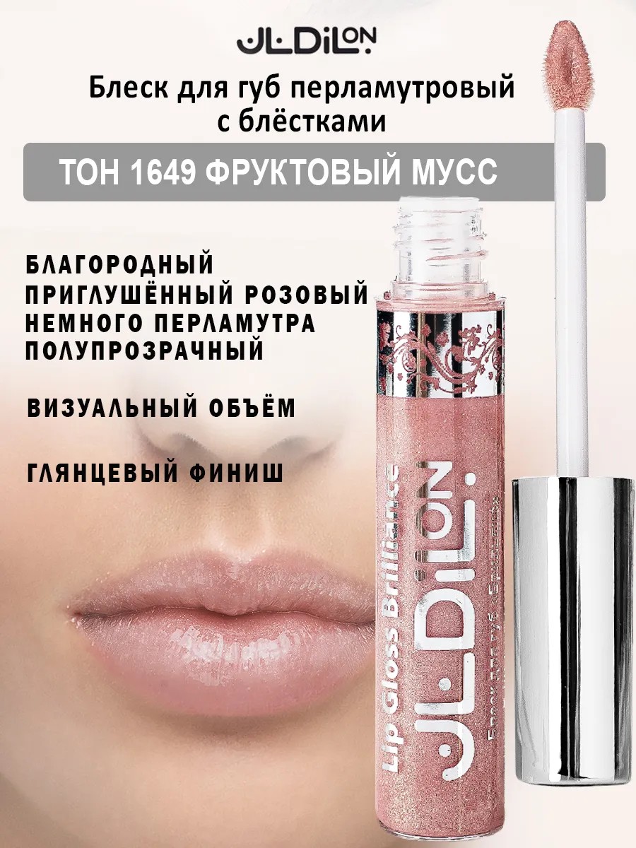 | Full product name | Lip gloss with glitter, transparent, pearlescent, nude, Dilon, tone 1649, Fruit mousse |