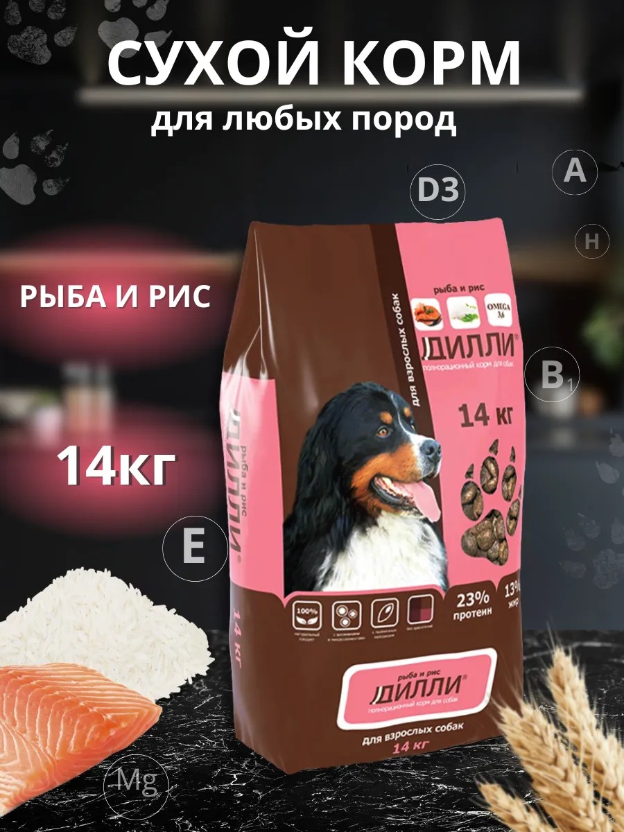 Дилли Корм сухой для собак любых пород Рыба и рис 14 кг