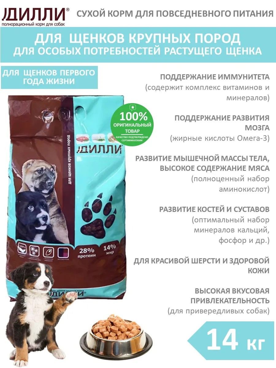 | Полное наименование товара | Дилли сухой корм для щенков крупных пород - 14 кг |