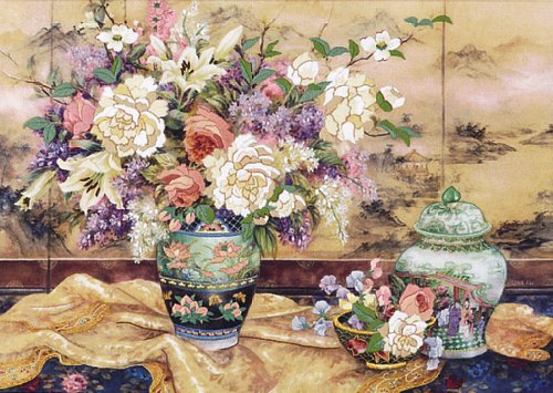 Oriental Splendor Crewel Kit stitched in wool and yarn. A myriad of authentic oriental details enhance this gorgeous floral display. This sumptuous still life is created with wool and acrylic yarns and cotton and metallic threads. Kit contains Persian wool and acrylic yarns cotton embroidery thread gold metallic thread design printed in full color on white homespun with selected areas marked for stitching needle and easy instructions including an easy-to-read multicolor chart. Finished Size: 20x14" (51x36cm) Designed by: Lena Liu. Made in USA.
