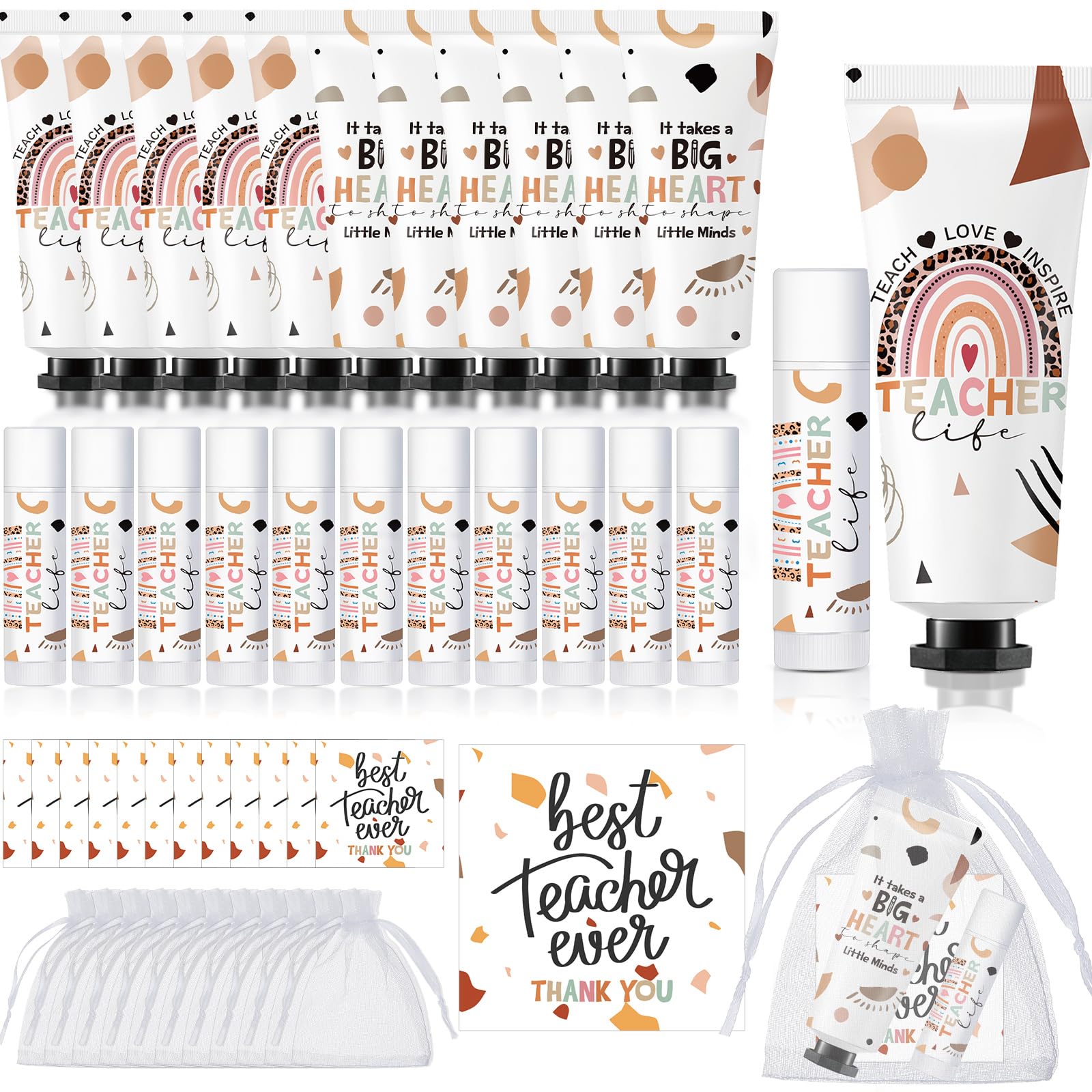 Expressions of Gratitude: the bulk teacher appreciation gifts are more than just skincare products They serve as a tangible expression of gratitude towards educators Each gift is printed with patterns and words on a teacher's theme, reinforcing our appreciation for their noble work. Teacher Themed Design: apart from the functionality, the holiday hand cream set is also aesthetically pleg Each gift boasts a teacher themed design, making them an attractive present suitable for teachers The playful and lovely patterns printed on each product echo the theme very well and make the gift set truly special. Practical Contents: the lip balm and hand cream set is not just thoughtful, but practical With a generous 20 ml of hand cream and 4.5 g of lip balm in each set, these are sure to provide lasting skin relief and lip care, bringing lasting satisfaction to beloved teachers. Reliable Ingredients: our lip balm holiday set utilizes reliable materials The lip balm is mainly made with beeswax and other safe ingredients to ensure optimal lip care While the hand cream is primarily composed of moisturizing glycerin to keep your hands soft, smooth, and moist. Comprehensive Gift Set: the hand cream lip balm gift set consists of an intimate set of products The delivery includes 24 sets of gifts including 24 lip balms, 24 hand creams, 24 white organza bags, and 24 thank you tags totaling 96 pieces, providing a comprehensive solution for teacher gifting needs.