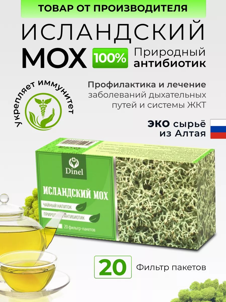 Возможно, вы слышали о легендарной растительности из далекой Исландии? Вот вам маленькая подсказка: "исландский мох" - это не просто растение. Это полезный травяной чай из горного Алтая - настоящее тайное оружие при борьбе с насморком, простудами и кашлем для мужчин и женщин. А также при заболеваниях ЖКТ и поддержания иммунитета. Бренд Dinel представляет вам уникальный алтайский фиточай – сбор лечебных трав, собранных на территории Российского и Монгольского Алтая. Так как эти места до сих пор остаются в первозданном виде, наш ирландский мох - 100% натуральный природный антибиотик с мощным противовоспалительным, антисептическим, антиоксидантным и антибактериальным свойствами. Лечит диарею, вздутие живота, простату, запор, пневмонию, гастрит, язву, цистит, уретрит, простатит, очищает кровь, замедляет старение клеток. А усниновая кислота, обладающая сильной антибиотической активностью, помогает от бронхита, заболеваний дыхательных путей и кишечника. Исланский мох цетрария содержит до 70% углеводов, 1-3% белков, 1-2% жиров, 1% воска, 3% камеди, 3% пигментов, 3-5% лишайниковых кислот, витамины В-12, С, микро и макро элементы: железо, титан, йод, медь, марганец. Комплексный препарат с тонизирующим; обволакивающим; отхаркивающим; противорвотным; успокаивающим (для спокойного сна); желчегонным; ранозаживляющим; иммуностимулирующим эффектами при длительном использовании. Станет незаменимым помощником для вашего здоровья в повседневной жизни. Используется в народной медицине на протяжении веков, и теперь вы можете наслаждаться его преимуществами, не выходя из дома. Кроме того, прекрасно подходит для ухода за кожей, так как он увлажняет и питает ее, придавая ей здоровый и сияющий вид.