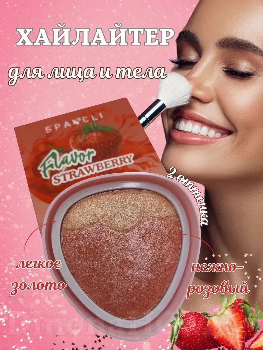 Пудровый хайлайтер-это уникальная пудра с мельчайшими сияющими частицами, которая буквально сливается с кожей и придает ей естественное сияние. Двойной хайлайтер-румяна можно наносить как сухим способом с помощью пушистой кисти, так и влажным, распылив фиксатор для макияжа на кисть. При нанесении влажным способом запеченная текстура приобретает насыщенный металлический оттенок и прекрасно подходит для использования как тени для век. При использовании в сухом виде он добавляет сияния и блеска коже, подчеркнет Вашу красоту. Компактный хайлайтер Sparcli - приятная текстура и идеально подобранные оттенки помогут в создании гармоничного образа. С помощью этой палетки ты можешь: изменить форму носа, выделить подбородок, подчеркнуть скулы, освежить лицо и многое другое. Визуально смоделирует лицо. Не требует много времени на создание макияжа. Главная роль в стробинге принадлежит рассыпчатый хайлайтеру - скульптурируй светом и бликами! Добавляй сияние для придания объема. Румяна придают коже здоровый и отдохнувший вид. Скульптор придаст рельефу лица выразительность и четкость. айлайтер для лица идеально подойдёт для нанесения поверх продуктов для выравнивания тона кожи. Бронзер и праймер так же можно использовать вместе и другими средствами для создания именно вашего эффектного образа! лагодаря компактности пудра хайлайтер удобно брать с собой и кремовый хайлайтер или жидкий хайлайтер для лица легко наносится и не оставляет липкости. Самый трендовый финиш в макияже лица! Включайте сияние на максимум с персиковым/клубничным хайлайтером Sparcli. Матирующий пудровый сухой люминайзер создает красивые блики на лице. Корректор можно применять на губы в качестве пыльцы. Водостойкая и минеральная, гелевая основа, прозрачная. Дает блистание на солнце. Яркие кристаллы украсят и придадут индивидуальность. Идеальный финиш в высветлении выделении отдельных участков.