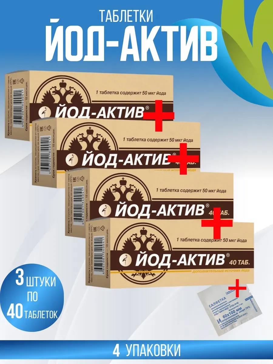 Йод-актив 40 шт. таблетки, 4 упаковки,+салфетка