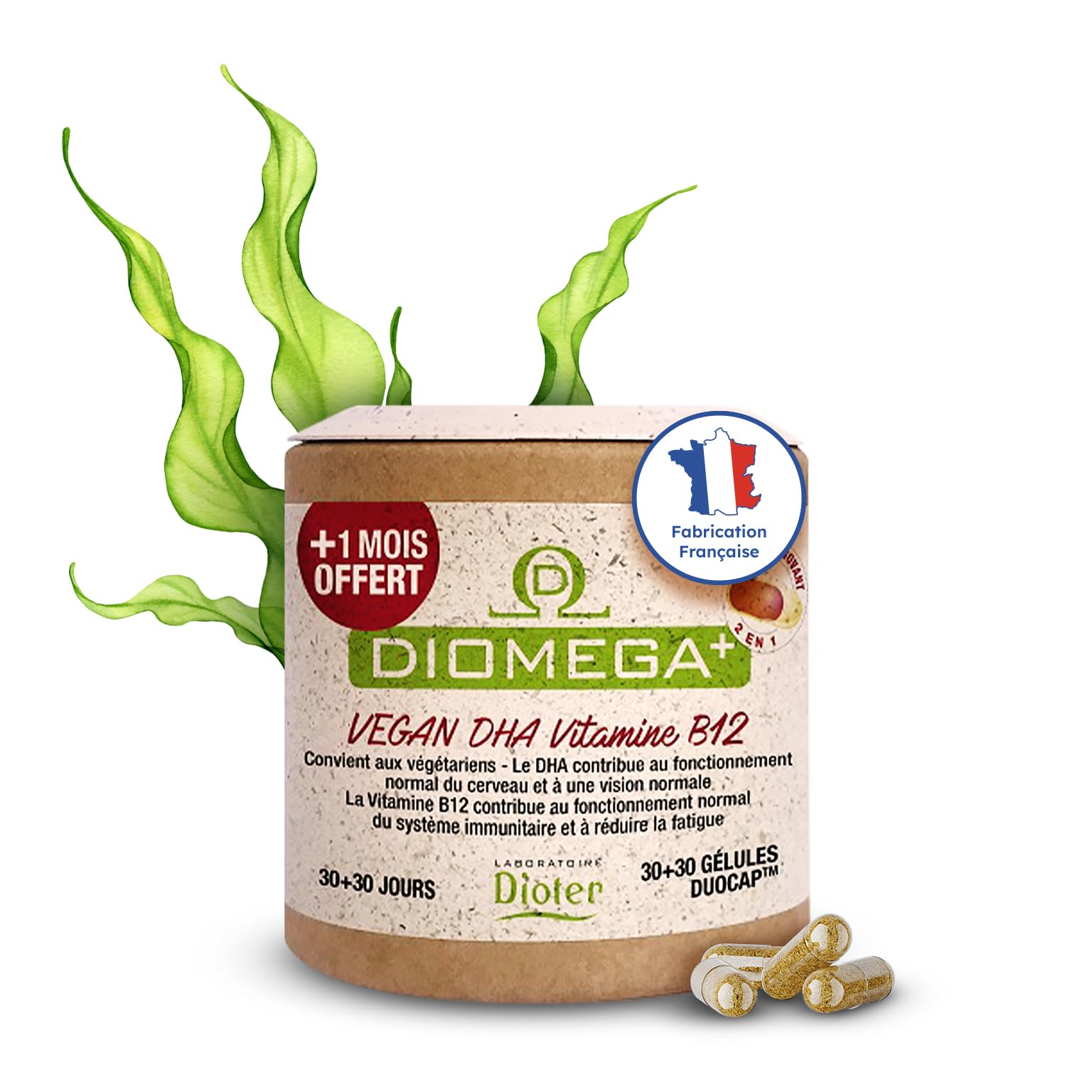 Dioméga Équilibre Cérébral, Oméga 3 végan, DHA d'Algues Vitamine B12 – Complément Alimentaire végan - Mémoire, Concentration, Vision Système Nerveux - 60 Gélules