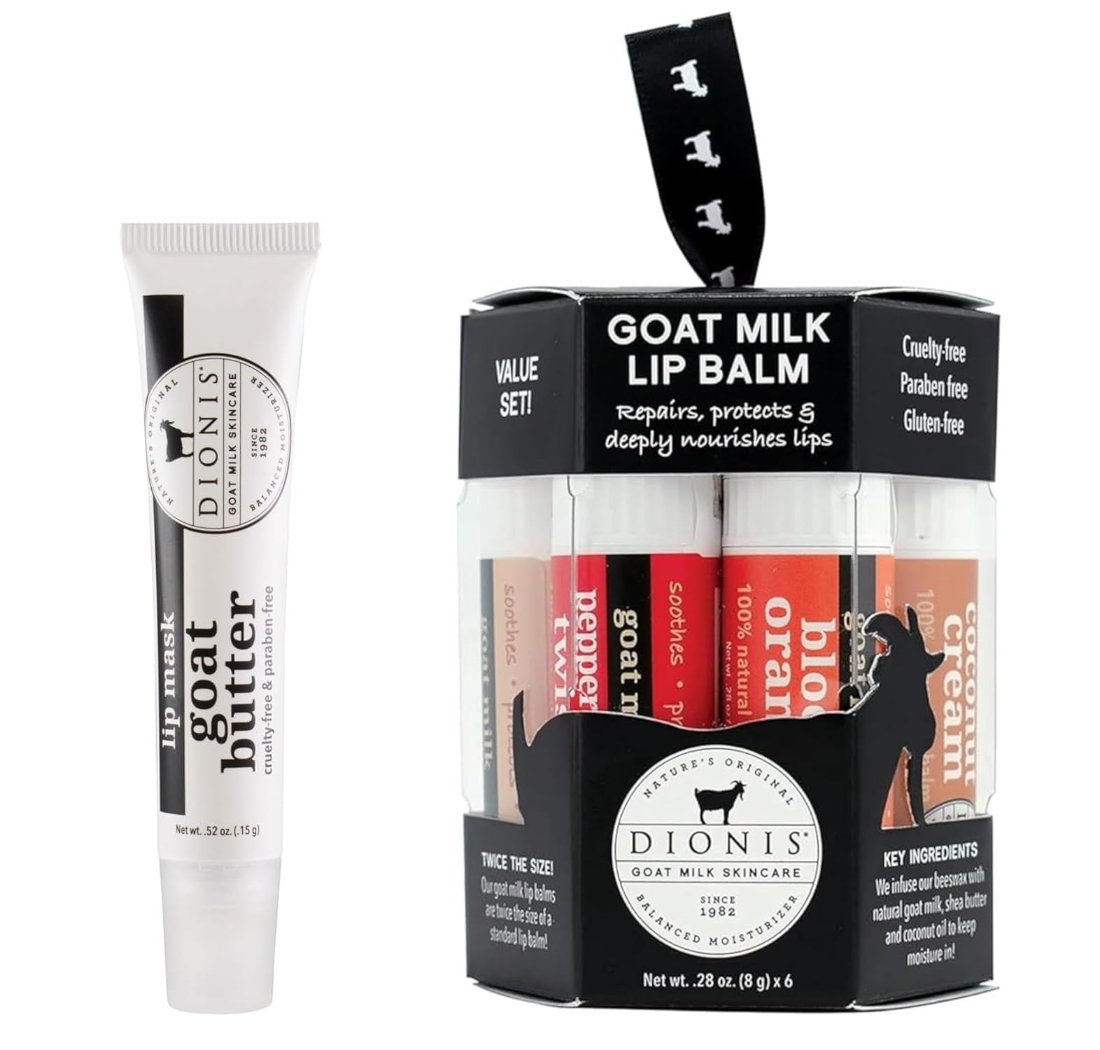 Dionis Goat Milk Lip Care Bundle: Overnight Lip Mask 6-Piece Lip Balm Ornament Achieve soft, smooth, and deeply moisturized lips day and night with this Dionis Goat Milk Lip Care Bundle. Combining an overnight treatment with six nourishing balms, this set is perfect for keeping lips hydrated, protected, and deliciously scented. Bundle Includes: Dionis Goat Butter Overnight Leave-On Lip Mask (Raspberry Chocolate Shortbread Scent): This rich, leave-on lip mask is designed to repair and restore dry, chapped lips overnight. Infused with goat milk, jojoba, and moringa oils, it forms a nourishing barrier that locks in moisture while you sleep, leaving lips soft and rejuvenated by morning. Dionis Goat Milk 6-Piece Lip Balm Ornament (2024 Edition): Enjoy on-the-go lip care with six delightful flavors: Vanilla, Coconut, Milk Honey, Berry, Peppermint, and Blood Orange. Each balm is crafted with shea butter and coconut oil, providing lasting hydration and protection for your lips throughout the day. This bundle offers the ultimate lip care routine, ensuring hydration and repair from day to night. Perfect for daily use, self-care routines, or as a thoughtful gift!Soothe, Protect Moisturize - Our unique formula has beeswax infused with natural goat milk, shea butter, and coconut oil to repair chapped lips and keep moisture in. Unlike shiny lip glosses and lipsticks, our lip balm leaves lips feeling moisturized and looking naturally healthy without the gooey residue that other products leave. Nourishing Luxury Gifts For Her - The gift of skincare is a gift that keeps on giving. Combine beauty, self care, and a touch of charm with this assorted lip balm set. The elegant ornament style packaging and attention to detail make this gift set truly stand out. Soothe, Protect Moisturize Lip Therapy - This intense overnight goat milk lip mask by Dionis will moisturize cracked, chapped and dry lips. The gentle goat milk formula melts onto lips, rescuing them from dry lips, leaving a rich dewy finish. Works While You Rest - Our rich, deeply hydrating formula glides on smoothly for long-lasting wear that stays put while you sleep. Formulated with deeply moisturizing ingredients, apply liberally before going to sleep. Lip Repair - Wake up to soft and supple lips with our intensely moisturizing goat butter overnight leave-on lip mask. Made with goat milk jojoba, raspberry, and moringa oils, this gentle formula will add moisture to cracked, chapped, and dry lips while you sleep.