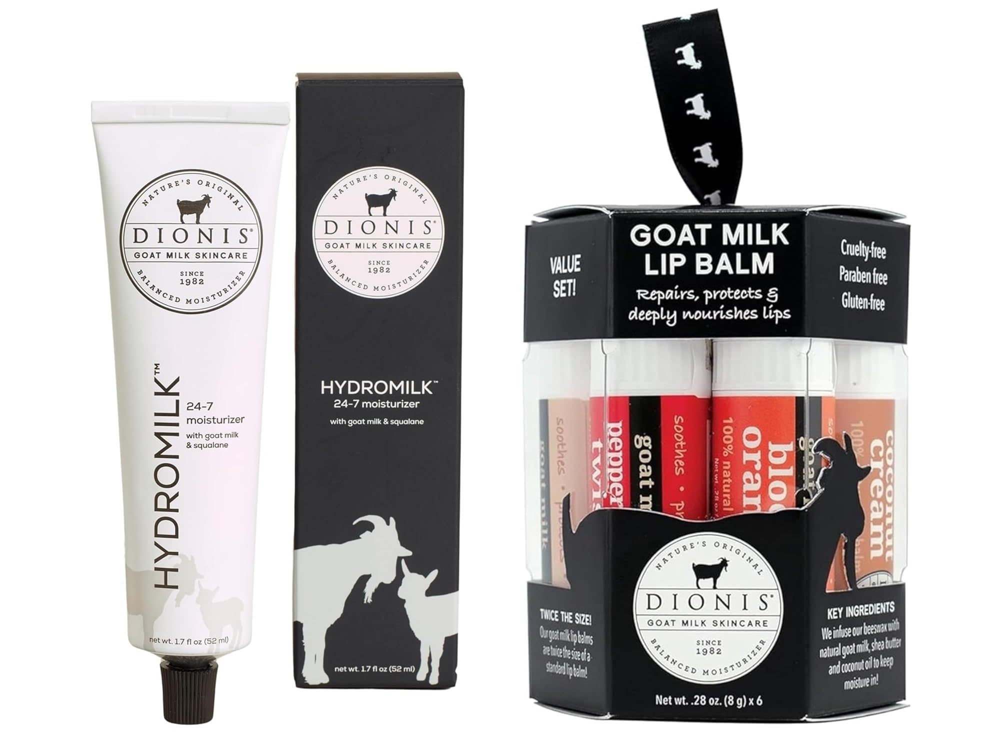 Dionis Goat Milk Skincare Bundle: 24 7 Moisturizer 6-Piece Lip Balm Ornament Enjoy complete hydration and care with this Dionis Goat Milk Skincare bundle, combining deep face moisturization and all-day lip hydration. Perfect for self-care routines or holiday gifting, this set covers all your essential skin needs with nourishing goat milk. Bundle Includes: Dionis Goat Milk Hydromilk 24-7 Moisturizer (1.7 fl oz): Experience long-lasting hydration with this ultra-moisturizing face cream. Ideal for all skin types, it absorbs quickly to deliver continuous hydration and a natural glow, all while being cruelty-free and paraben-free. Your skin will feel soft, smooth, and revitalized around the clock. Dionis Goat Milk 6-Piece Lip Balm Ornament (2024 Edition): Pamper your lips with six delectable flavors: Vanilla, Coconut, Milk Honey, Berry, Peppermint, and Blood Orange. Enriched with shea butter and coconut oil, these hydrating balms provide a protective layer to keep your lips soft and nourished, perfect for daily use or as a festive gift. Indulge in the perfect combination of deep facial hydration and luscious lip care with this naturally nourishing Dionis bundle.Soothe, Protect Moisturize - Our unique formula has beeswax infused with natural goat milk, shea butter, and coconut oil to repair chapped lips and keep moisture in. Unlike shiny lip glosses and lipsticks, our lip balm leaves lips feeling moisturized and looking naturally healthy without the gooey residue that other products leave. Nourishing Luxury Gifts For Her - The gift of skincare is a gift that keeps on giving. Combine beauty, self care, and a touch of charm with this assorted lip balm set. The elegant ornament style packaging and attention to detail make this gift set truly stand out. Gentle Fragrance Free Formula - Our cruelty free and paraben free formula is dermatologist tested, ensuring it's gentle enough for all skin types. Its clean, non-irritating ingredients ensure that your skin feels comfortable and nourished, without causing breakouts or irritation. Nourishing Vitamins and Natural Ingredients - Dionis Goat Milk Hydromilk Moisturizer harnesses the power of goat milk, known for its rich composition of vitamins A, C, D, E, and B complex, as well as essential lipids and triglycerides. These nutrients deeply nourish and hydrate the skin, promoting a balanced microbiome and a healthy, radiant complexion. Ultimate Face Hydration - Experience what can only be described as skincare heaven. This decadent moisturizer is designed to balance your skin's microbiome, delivering a healthy-looking complexion. With daily use, it effectively reduces the appearance of fine lines and wrinkles, and enhances skin's firmness, elasticity, and radiance. Perfect for day and night application.