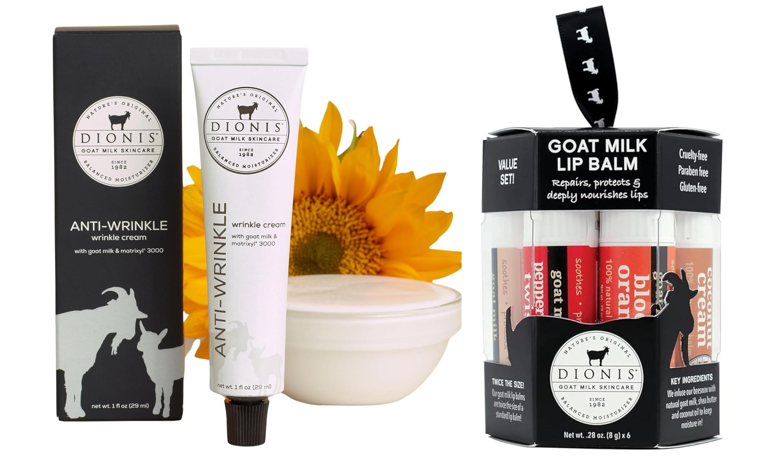 Dionis Goat Milk Skincare Bundle: Anti-Wrinkle Cream 6-Piece Lip Balm Ornament Revitalize and nourish your skin with this special Dionis Goat Milk Skincare bundle, combining age-defying care and deep hydration for lips. Perfect for self-care or gifting, this set brings together essentials for smooth, glowing skin. Bundle Includes: Dionis Goat Milk Anti-Wrinkle Cream (1 fl oz): This potent anti-aging cream helps reduce the appearance of fine lines and wrinkles, while hydrating and replenishing skin. Made with nourishing goat milk, it's gentle and effective, ideal for enhancing skin's youthful glow. Dionis Goat Milk 6-Piece Lip Balm Ornament (2024 Edition): Enjoy lasting moisture for your lips with six delightful flavors: Vanilla, Coconut, Milk Honey, Berry, Peppermint, and Blood Orange. Formulated with shea butter and coconut oil, these lip balms deliver intense hydration and protection, making them perfect for on-the-go or as stocking stuffers. This bundle is an ideal treat for radiant skin and soft lips, made with natural, goat milk-infused formulas to pamper and protect.Soothe, Protect Moisturize - Our unique formula has beeswax infused with natural goat milk, shea butter, and coconut oil to repair chapped lips and keep moisture in. Unlike shiny lip glosses and lipsticks, our lip balm leaves lips feeling moisturized and looking naturally healthy without the gooey residue that other products leave. Nourishing Luxury Gifts For Her - The gift of skincare is a gift that keeps on giving. Combine beauty, self care, and a touch of charm with this assorted lip balm set. The elegant ornament style packaging and attention to detail make this gift set truly stand out. Promotes Firmer, Youthful-Looking Skin - The combination of goat milk and Matrixyl 3000 works synergistically to boost skin's elasticity and firmness. Regular use helps even out skin tone, diminish fine lines and wrinkles, and enhance overall radiance. Experience the transformative effects of this potent anti-aging cream. Clean, Non-Irritating Ingredients - This anti-wrinkle cream is cruelty free, paraben free, and dermatologist tested, ensuring it is gentle and safe for all skin types. Its non-greasy and fragrance free formulation absorbs quickly, leaving your skin feeling fresh and comfortable without any heavy residue. Advanced Anti-Wrinkle Formula with Matrixyl 3000 - Hydrate and significantly reduce the appearance of fine lines and wrinkles with this powerful anti-wrinkle cream. Formulated with goat milk and Matrixyl 3000, it mimics the effects of naturally occurring peptides like collagen, promoting firmer and younger-looking skin. Perfect for achieving an even skin tone and smooth texture.