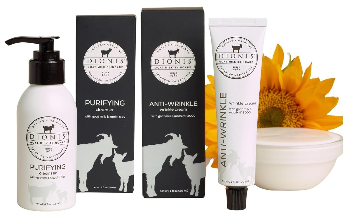 Dionis was founded in 1982 on a goat milk farm with the mission to innovate, redefine, and deliver high-quality, affordable skin care products, all made with the nourishing benefits goat milk offers empowering everyone to love the way they look feel in their skin. We're committed to using only the highest quality ingredients in our products. Our full line of goat milk skincare falls under Clean Beauty umbrella, a promise we're proud to live up to. In addition, all of our products are certified by third parties as cruelty-free and dermatologist-tested.EASY-TO-USE DAILY SKINCARE ROUTINE: After cleansing and before moisturizing, apply a thin layer of the anti-wrinkle cream to your skin. Suitable for both AM or PM routines, this cream integrates seamlessly into your skincare regimen. Remember, it's for external use only—ensure consistent use for the best results and enjoy a more youthful, glowing appearance. PROMOTES FIRMER, YOUTHFUL-LOOKING SKIN: The combination of goat milk and Matrixyl 3000 works synergistically to boost skin's elasticity and firmness. Regular use helps even out skin tone, diminish fine lines and wrinkles, and enhance overall radiance. Experience the transformative effects of this potent anti-aging cream. ADVANCED ANTI-WRINKLE FORMULA WITH MATRIXYL 3000: Hydrate and significantly reduce the appearance of fine lines and wrinkles with this powerful anti-wrinkle cream. Formulated with goat milk and Matrixyl 3000, it mimics the effects of naturally occurring peptides like collagen, promoting firmer and younger-looking skin. Perfect for achieving an even skin tone and smooth texture. POWERFUL COMBINATION OF GOAT MILK AND KAOLIN CLAY: Harness the power of goat milk and kaolin clay in one effective cleanser. Goat milk provides a rich source of vitamins A, C, D, E, and B complex, lipids, and triglycerides to nourish and hydrate the skin. Kaolin clay works to draw out impurities, excess oil, and toxins, ensuring a deep, thorough cleanse without stripping the skin of essential moisture. DETOXIFYING PURIFYING CLEANSER FOR OILY SKIN: This purifying cleanser is specially formulated to detoxify and balance oily skin, making it ideal for those dealing with excess oil, dullness, and uneven texture. Infused with probiotics naturally found in goat milk, it helps to clear impurities and minimize the appearance of pores, leaving your skin refreshed and rejuvenated.