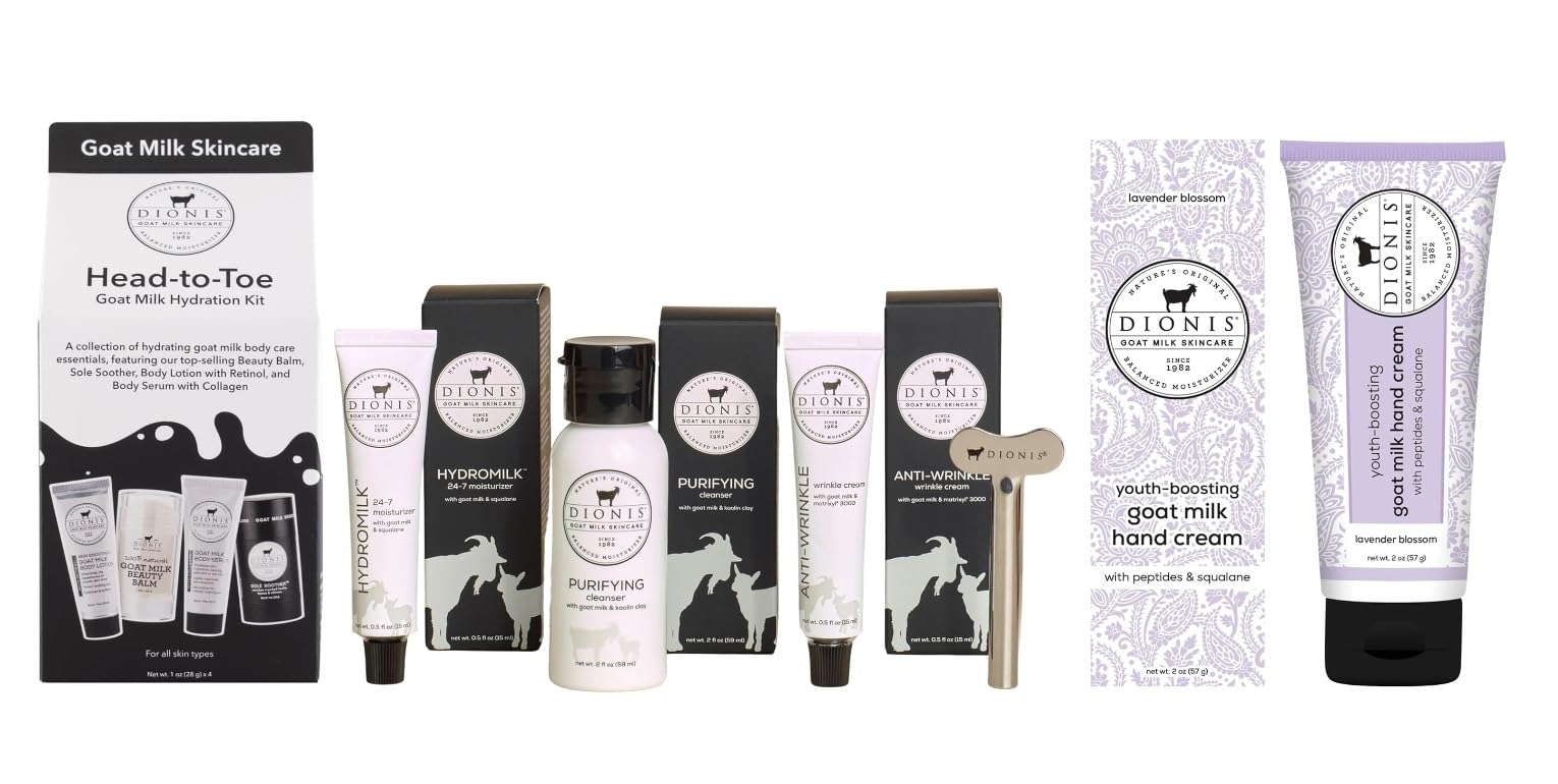 Dionis was founded in 1982 on a goat milk farm with the mission to innovate, redefine, and deliver high-quality, affordable skin care products, all made with the nourishing benefits goat milk offers empowering everyone to love the way they look feel in their skin. We're committed to using only the highest quality ingredients in our products. Our full line of goat milk skincare falls under Clean Beauty umbrella, a promise we're proud to live up to. In addition, all of our products are certified by third parties as cruelty-free and dermatologist-tested.FRIENDLY FOR EVERYONE: Dionis products are dermatologist tested, cruelty-free paraben-free, sulfate-free, and made in the USA. For extra sensitive skin, they have unscented options as well. Feel good about feeling good with Dionis Goat Milk Skincare Products. LAVENDER BLOSSOM: A delightful Aurelian lily blossom with juicy orange and cassis, surrounded by jasmine, rose, and lavender on a creamy background of coconut, apricot nectar, and musk. Generously apply to skin until well absorbed. Used daily, this rich, non-greasy formula will leave your skin feeling hydrated and silky smooth. COMPLETE GOAT MILK-INFUSED SKINCARE ROUTINE: Experience radiant, rejuvenated skin with our 3-Step Starter Kit featuring mini, travel-friendly sizes of our goat milk infused skincare essentials. Ideal for all skin types, it keeps your complexion balanced and healthy-looking. LOTION FOR DRY SKIN: Revitalize your skin with our Goat Milk Body Serums. Our Collagen lotion smooths, intensely hydrates, and enhances skin firmness. For optimal results, apply our goat milk lotion with Retinol at night avoiding the face and eye area. Caution: Perform a patch test for potential retinol-related irritation before regular use. HYDRATING MOISTURIZER: Apply a small amount of Beauty Balm to tame flyaway hair, as a lip balm, on cuticles, or to highlight cheekbones suitable for any dry spot on your body. Rub Sole Soother along cracked heels, knees, or elbows blend for complete absorption to soften and smooth. Best results with daily use.