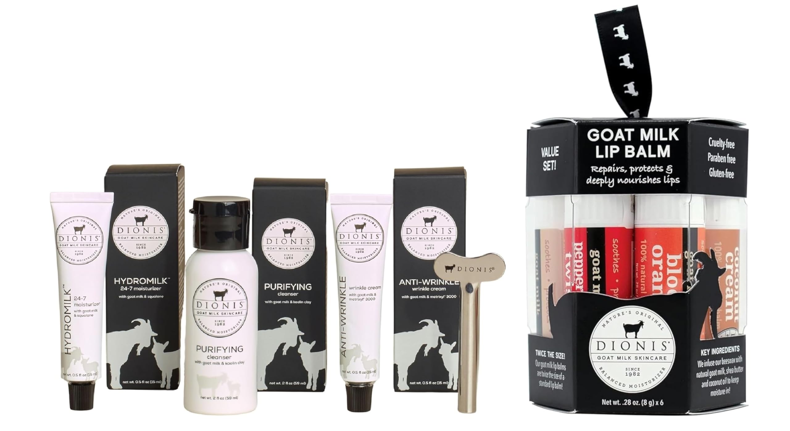 Dionis Goat Milk Skincare Lip Care Bundle: Core Collection Starter Set 6-Piece Lip Balm Ornament Refresh and nourish your skin and lips with this Dionis Goat Milk Skincare Lip Care Bundle. Featuring a three-step skincare routine and a festive lip balm collection, this set is the perfect introduction to goat milk skincare and makes an excellent gift. Bundle Includes: Dionis Goat Milk Skincare Core Collection Starter Set: Start your skincare journey with this simple yet effective 3-step routine that hydrates, rejuvenates, and promotes a natural glow. Formulated to support anti-aging for all skin types, each product is cruelty-free and paraben-free, ensuring a gentle and nurturing experience for the skin. Dionis Goat Milk 6-Piece Lip Balm Ornament (2024 Edition): Treat your lips to lasting moisture with six fun flavors: Vanilla, Coconut, Milk Honey, Berry, Peppermint, and Blood Orange. Each balm is enriched with shea butter and coconut oil, protecting and restoring lips with every application. This festive ornament makes a perfect stocking stuffer or daily go-to. Enjoy complete self-care with this bundle, which combines a refreshing skincare routine and soothing lip hydration. Perfect for gift-giving or as a luxurious treat for yourself!Soothe, Protect Moisturize - Our unique formula has beeswax infused with natural goat milk, shea butter, and coconut oil to repair chapped lips and keep moisture in. Unlike shiny lip glosses and lipsticks, our lip balm leaves lips feeling moisturized and looking naturally healthy without the gooey residue that other products leave. Nourishing Luxury Gifts For Her - The gift of skincare is a gift that keeps on giving. Combine beauty, self care, and a touch of charm with this assorted lip balm set. The elegant ornament style packaging and attention to detail make this gift set truly stand out. Effective Anti-Aging Formula - Combat fine lines and wrinkles with our Anti-Wrinkle Cream, paired with Hydromilk 24-7 Moisturizer for long-lasting hydration and improved skin elasticity, promoting a youthful glow. Nourishing Benefits of Goat Milk - Packed with vitamins A, C, D, E, and B complex, along with lipids and triglycerides, our products preserve your skin's microbiome, enhancing moisture retention and suppleness for a revitalized appearance. Complete Goat Milk Infused Skincare Routine - Experience radiant, rejuvenated skin with our 3-Step Starter Kit featuring mini, travel-friendly sizes of our goat milk infused skincare essentials. Ideal for all skin types, it keeps your complexion balanced and healthy-looking.
