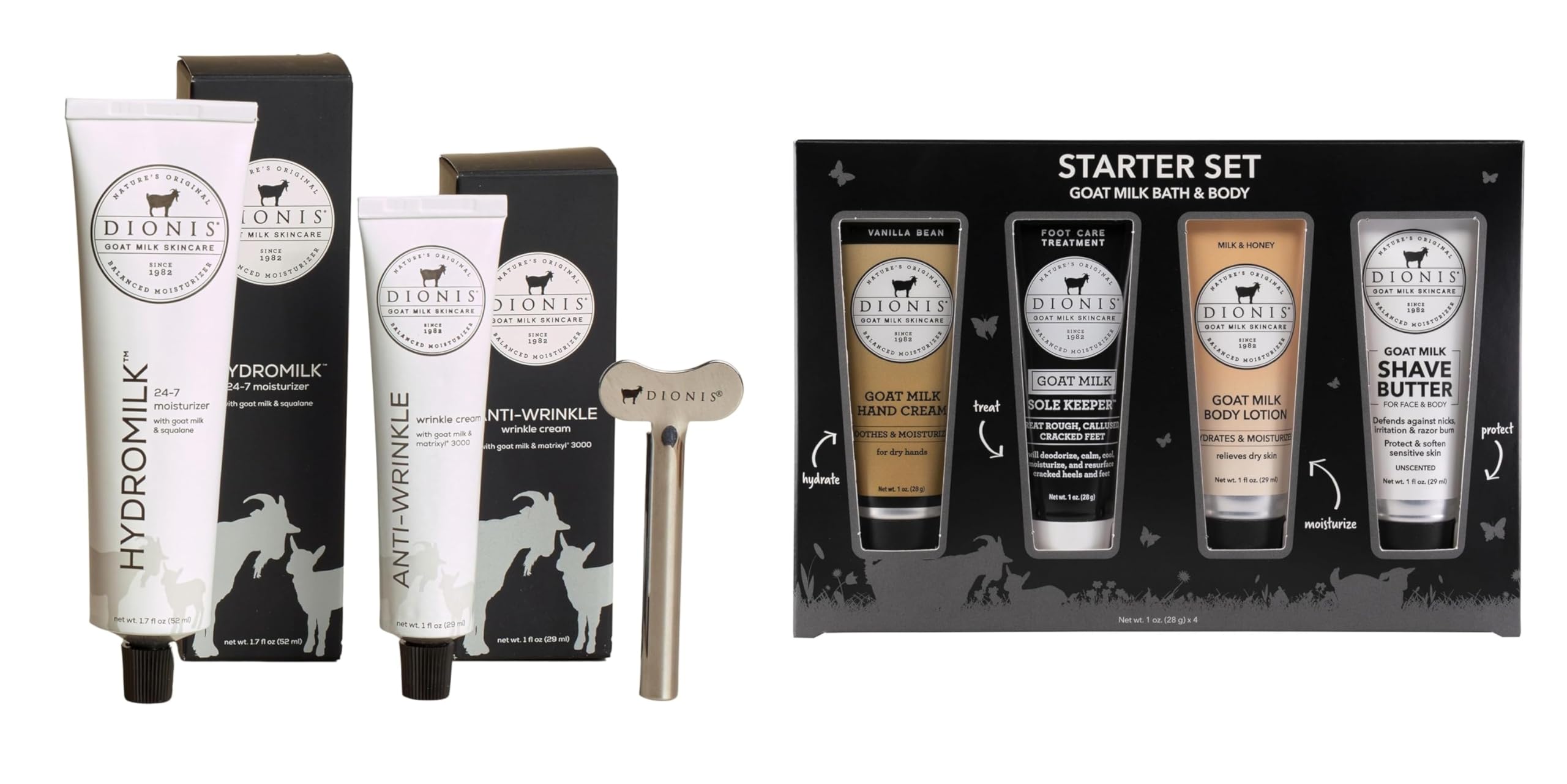 Dionis Goat Milk Skincare Hand Cream Gift Sets - Assorted Scented Travel Size Items In a Gift Box - Mini Hand Lotion Self Care Gifts for Women, Cruelty Free Lotion For Dry Skin,Bath Body Starter Kit This bundle includes two luxurious skincare sets for a complete head-to-toe care routine: Dionis Goat Milk Skincare Essentials Set: Featuring Hydromilk Moisturizer, Anti-Wrinkle Cream, and a roller key, this cruelty-free, paraben-free kit is perfect for all skin types, providing hydration and anti-aging benefits. Dionis Goat Milk Skincare Hand Cream Gift Set: A collection of assorted scented travel-size hand creams, perfect for moisturizing dry skin while on the go. These cruelty-free lotions make a great gift for women. Pamper yourself or a loved one with this nourishing skincare duo!Great For All Skin Types - Dionis products are dermatologist tested, cruelty-free paraben-free, gluten-free, sulfate-free, and made in the USA. For extra sensitive skin, try our unscented options. Feel good about feeling good with Dionis Goat Milk Skincare Products. Hand Cream Set - Our top selling Inspire gift set includes an assortment of our most popular Dionis goat milk hand cream fragrances these hand creams will hydrate and moisturize dry hands without leaving a greasy residue. Rich in Nutrients for Healthy Skin - Goat milk is naturally rich in vitamins A, C, D, E, and B complex, as well as lipids and triglycerides. These nutrients help preserve your skin's microbiome, maintaining moisture and suppleness. Enjoy the benefits of these nourishing ingredients for improved skin firmness, elasticity, and radiance. Included Roller Key for Even Distribution - Utilize the included roller key to effortlessly dispense Hydromilk 24-7 Moisturizer and Anti-Wrinkle Cream onto your face and neck. This precise application method ensures even coverage and absorption, enhancing your skincare routine with ease and effectiveness. Comprehensive Skincare Essentials Set - The Dionis Goat Milk Skincare Essentials Set includes everything you need for a complete skincare routine. This set features a 1.7 fl oz Hydromilk 24-7 Moisturizer, a 1 fl oz Anti-Wrinkle Cream, and a Roller Key, providing you with essential products to maintain a healthy, balanced complexion.