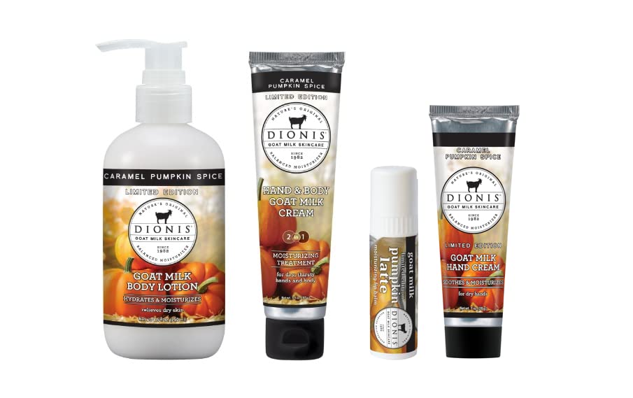 Get all of the best selling Fall products Dionis has to offer in one purchase! 8.5 oz Lotion: The Dionis goat Milk Skincare Lotion is rich and creamy. With regular use it's designed to ease rough skin, making it smooth and silky. It also does not leave a greasy residue like many lotions, so you can apply it right before putting on your favorite sweater. 3.3 oz Cream: The All In One Solution Our hand and body cream has all the skin-soothing ingredients as our original formula, with no greasy residue. This moisturizing treatment will soothe and hydrate dry, thirsty hands and bodies. Hand Cream Lip Balm Set: This Pumpkin Goat Milk Hand and Lip Gift Set by Dionis will nourish and condition your skin and lips. The hand cream's formula is packed with goat milk that naturally contains vitamins and minerals to nourish and help retain skin moisture, making it ideal for those with dry, thirsty hands. This unique formula is rich but not greasy. The lip balm is twice the size of a standard lip balm and it works. It is infused with beeswax and natural goat milk, shea butter and coconut oil to repair chapped, cracked lips and lock in moisture, for long term comfort.Responsibly Sourced - Our goat milk is sourced from privately-owned family farms in the United States. These dairy goats are fed a balanced, vegetarian diet, which is full of nutrients, and free of antibiotics, hormones, animal by-products, and preservatives. This bar soap is also packaged in a recyclable box for the most sustainable solution for cleansing and nurturing your body. Bigger Means More Lip Moisture - Twice the size of a standard lip balm, Dionis Goat Milk Skincare Lip Balm is the whole package. With all 100 natural ingredients, we infuse our beeswax with Goat Milk, Shea Butter, and Coconut Oil to repair chapped lips and keep moisture in. Naturally Moisturizing - Made with natural goat milk that is packed with vitamins and minerals, this hand cream lotion for dry skin will nourish and help retain skin's moisture - an ideal solution for those of us with dry, working hands. Skin's Best Friend - The Dionis goat Milk Skincare Lotion is rich and creamy. With regular use it's designed to ease rough skin, making it smooth and silky. It also does not leave a greasy residue like many lotions, so you can apply it right before putting on your favorite sweater. Caramel Pumpkin Spice - One of our limited edition scents! Caramel Pumpkin Spice is a blend of rich butter, cozy vanilla, and powdered sugar, enhanced by cinnamon and aromatic love.