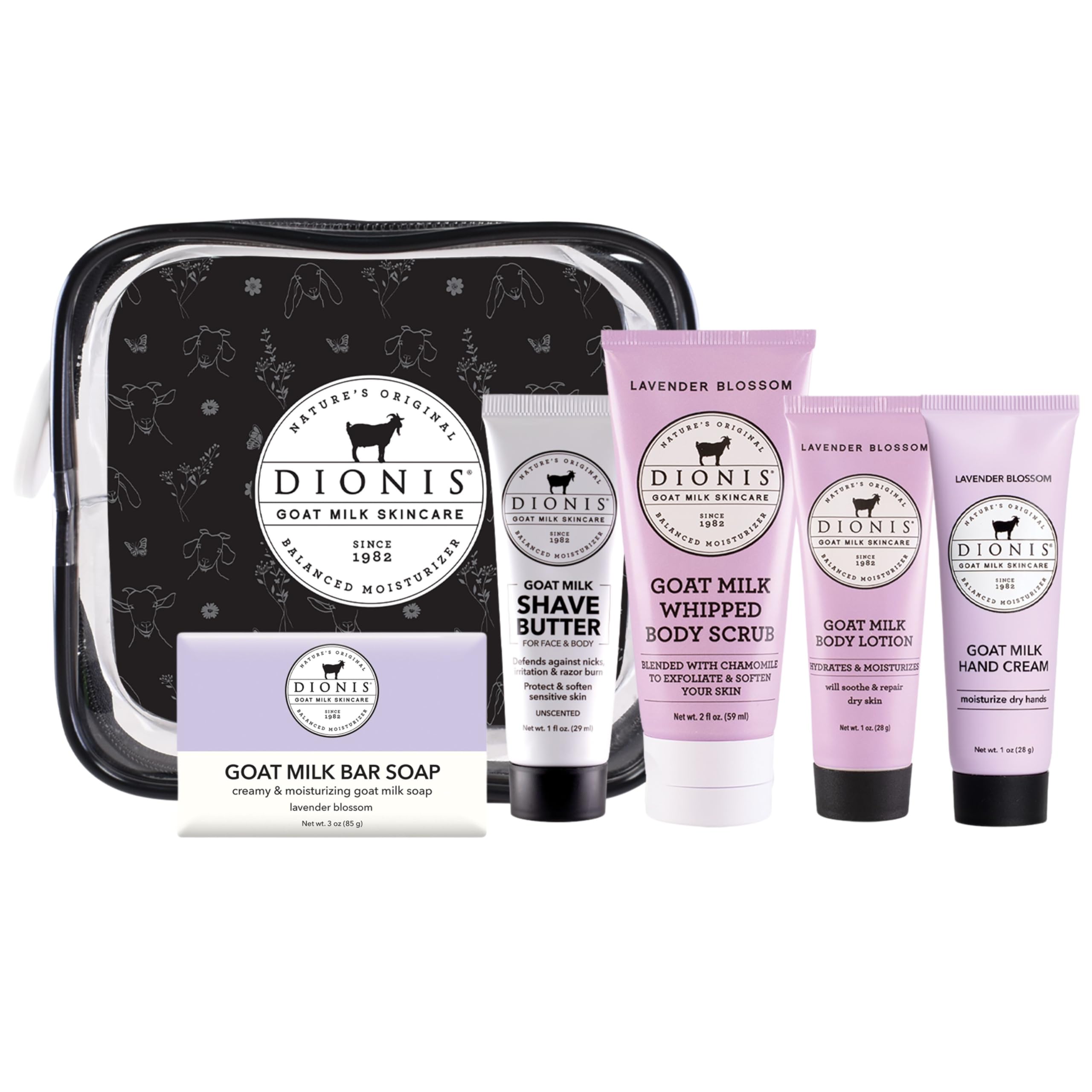 Stay fresh and nourished wherever you go with our lavender blossom goat milk travel essentials kit. Perfect for a mini getaway or a trip to the gym, this six-piece kit is designed to cleanse, exfoliate, hydrate, and moisturize your skin while offering the skin-loving benefits of goat milk, loaded with proteins, fats, vitamins, and minerals that deeply nourish and hydrate. Includes 3 oz Lavender Blossom Goat Milk Bar Soap, 1 oz Lavender Blossom Goat Milk Hand Cream, 1 oz Lavender Blossom Whipped Body Scrub, 1 oz Lavender Blossom Goat Milk Body Lotion, 1 oz Goat Milk Shave Butter a reusable travel bag.Responsibly Sourced - Our goat milk is sourced from privately-owned family farms in the United States. These dairy goats are fed a balanced, vegetarian diet, which is full of nutrients, and free of antibiotics, hormones, animal by-products, and preservatives. This bar soap is also packaged in a recyclable box for the most sustainable solution for cleansing and nurturing your body. Great For All Skin Types - Dionis products are dermatologist tested, cruelty-free paraben-free, gluten-free, sulfate-free, and made in the USA. For extra sensitive skin, try our unscented options. Feel good about feeling good with Dionis Goat Milk Skincare Products. Our Shave Butter is free of fragrance but rich in moisture. Skin's Best Friend - Goat milk is naturally enriched with high amounts of protein, fat, iron, and lots of vitamins. It has a pH nearly the same as human skin that allows our product to easily absorbed into human skin with no greasy residue, keeping you moisturized and nourished. On The Go Self Care - Whether it's a mini getaway or a visit to the gym, keep your skin looking and feeling its best with this goat milk travel kit. With a reusable, travel-friendly bag filled with bar soap, whipped body scrub, body lotion, hand cream, and shave butter, your self-care needs will be complete. Travel Essentials - This luxurious bundle of goat milk bath body essentials delivers the hydration and moisture your skin craves, no matter where you are. Delightful aurelian lily blossom, juicy orange, and cassis, surrounded by jasmine, rose, and lavender on a creamy background of coconut, apricot nectar, and musk.