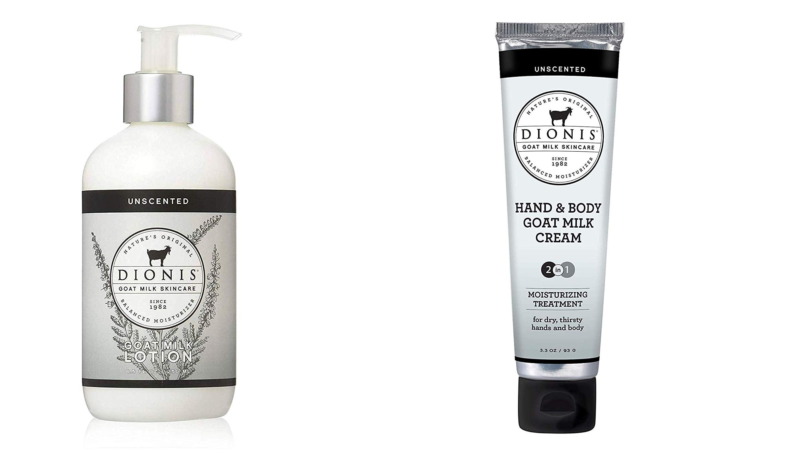 Dionis - Goat Milk Skincare Unscented Lotion (8.5 oz) & Hand and Body Cream (3.3oz) Bundle - Made in the USA - Cruelty-free and Paraben-free