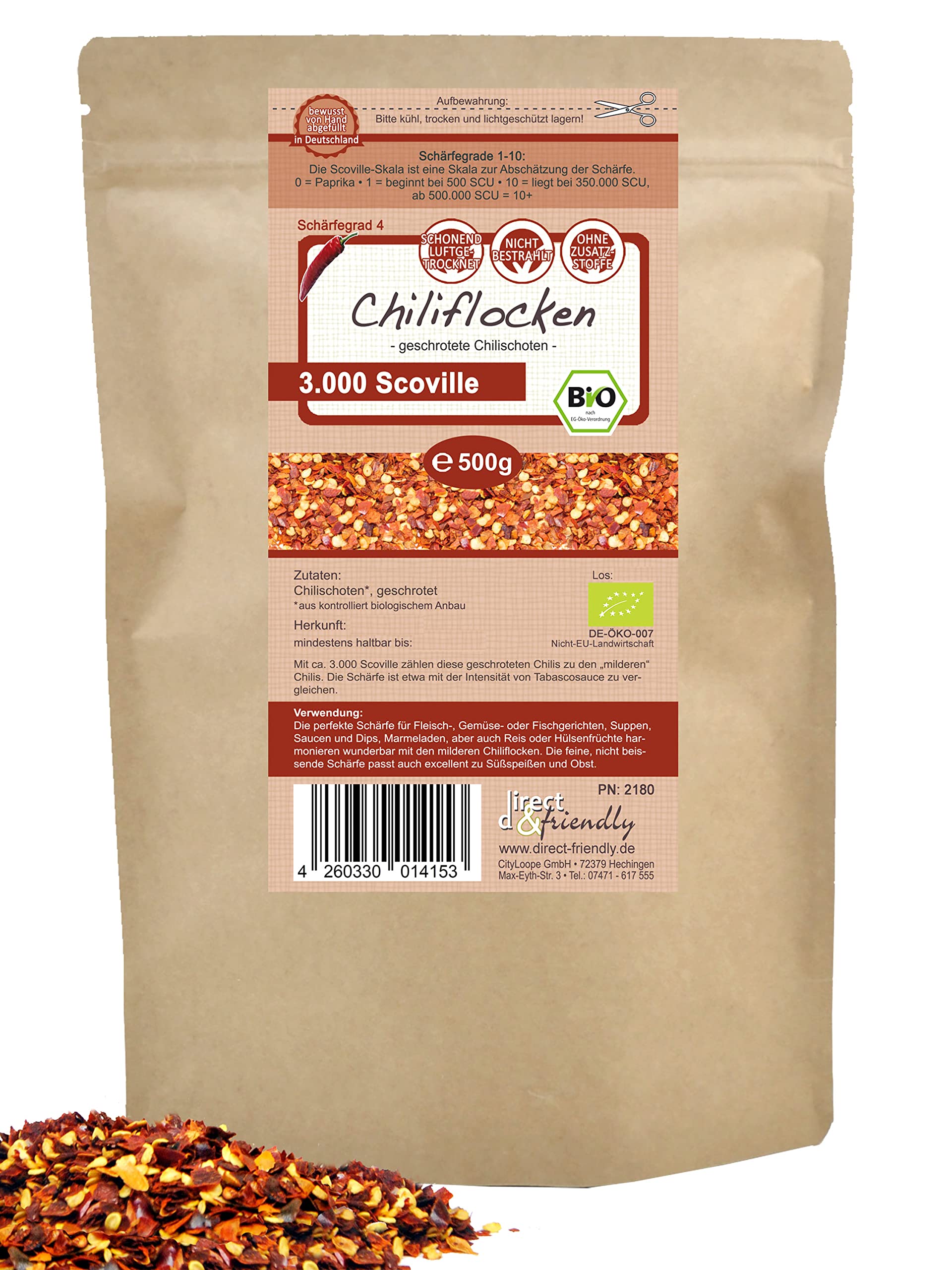 100 % quality- color and valuable active/ingredients (enzymes, secondary plant substances, essential oils and many flavonoids) are concentrated.100% natural product - without preservatives, flavor enhancers and without artificial aroma or other additives from controlled organic cultivation.It is filled in the best organic quality of Direct & Friendly (control point: de Öko 007), with love and care, by hand in a practical, closed aroma lock bag!.100% taste - unforgettable sharp enjoyment - Our milder chilli flakes are also suitable for preparing desserts.Fruity sweetness, hits mild sharpness.However, the amount should be dosed so that the harmonious aroma and the mild-sharp taste can develop fine without killing the dessert.100% mild sharpness - fits wonderfully with meat, stews, pasta, soups and sauces, salsa or savory dips.Great also for vegetarian dishes such as grilled cheese, vegetables or savory rice dishes and can be used well by chilli beginners.To further intensify the flavors and sharpness, briefly roast the desired amount of chilli in oil!.100% chili - Our scraped chili peppers (no China goods) are piquant and aromatic -mild - in the practical storage pack, perfect for refilling a chilli mill - perfectly suitable - and the natural sharpener in the kitchen.With their level of sharpness, our chilli flakes are in the lower midfield of the sharpness scala.100 % QUALITÄT - schonend getrocknet werden Farb- und wertvolle Wirk-/Inhaltsstoffe (Enzyme, sekundäre Pflanzenstoffe, ätherische Öle und viele Flavonoide) konzentriert. 100% NATURPRODUKT - ohne Konservierungsstoffe, Geschmacksverstärker und ohne künstliche Aroma- oder sonstige Zusatzstoffe aus kontrolliert biologischem Anbau. Er wird in bester Bio-Qualität von direct&friendly (Kontrollstelle: DE ÖKO 007), mit Liebe und Sorgfalt, von Hand im praktischen, wieder verschließbaren Aroma-Verschlussbeutel abgefüllt!. 100% GESCHMACK - unvergesslicher SCHARF-GENUSS - Unsere milderen Chiliflocken eignen sich auch zur Zubereitung von Süßspeisen. Fruchtige Süße, trifft milde Schärfe. Die Menge sollte hierbei jedoch wohl dosiert werden, damit das harmonische Aroma und der mild-scharfe Geschmack sich fein entfalten kann, ohne die Süßspeise zu erschlagen. 100% MILDE SCHÄRFE - passt wunderbar zu Fleisch, Eintöpfen, Pasta, Suppen und Saucen, Salsa oder pikanten Dips. Toll auch zu vegetarischen Gerichten wie gegrilltem Käse, Gemüse oder pikanten Reisgerichten und kann gut von Chili-Anfängern genutzt werden. Um die Aromen und SCHÄRFE WEITER ZU INTENSIVIEREN, die gewünschte Menge Chili kurz in Öl anrösten!. 100% CHILI - Unsere geschroteten Chilischoten (keine China-Ware) sind pikant und aromatisch-mild - in der praktischen Vorratspackung, zum Nachfüllen einer Chili-Mühle perfekt geeignet - und der natürliche Scharfmacher in der Küche. Mit ihrem Schärfegrad liegen unsere Chiliflocken im unteren Mittelfeld der Schärfe-Scala.direct&friendly Bio Chili getrocknet mild geschrotet Chiliflocken (500 g)