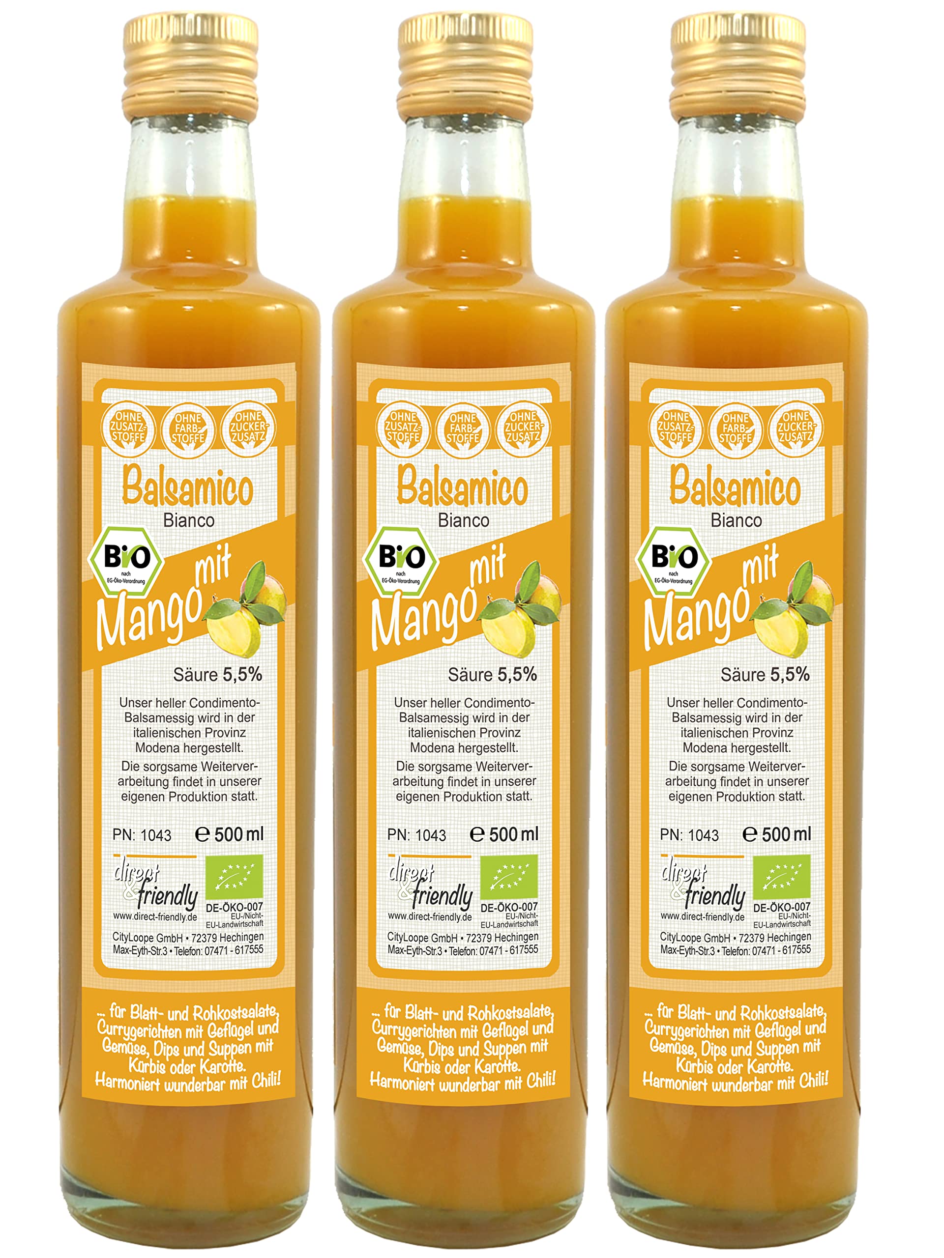 product Mango-Balsam Condimento Bianco-White Bio-Condimento Bianco from the northern Italian province of Modena with fruity mango Production The Condimento Aceto Bianco is manufactured exclusively in the Italian province of Modena.A mild fruity balsamic vinegar with an acid of 5.5%is created from white wine vinegar and concentrated grape must;This acid comes exclusively from wine and not from other herbal raw materials. The fruity aroma of mango plus the mild acidity of our Condimento Bianco result in a real aroma. Tip Our mango balm Condimento Bianco not only fits all leaf salads, but is the perfect companion to carrot and herb salads, or many Asian dishes. But it also gives soups and marinades a very special note. In compositions with chilli or ginger, the fruity and sharp aroma invites you to experiment. Or try our mango balm Condimento Bianco as a non -alcoholic aperitif or digestif with a little mineral water - by the way, vinegar is particularly good for the thirst! Our operation is organic certified de-Öko-007 Ingredients / ingredients White wine vinegar*, grape must concentrate*, Mangopüree*(*from controlled organic cultivation) Address manufacturer/importer CityLoope GmbH, Max-Eyth-Str.3, D-72379 Hechingen, Tel.: +49 7471 617 555 More 100% responsibility and transparency-only pure natural products in the best organic quality of Direct & Friendly (control point: de ÖKO 007), refined and filled with love and care in Germany!.100% pleasure - since we completely do without the use of stabilizers and thickening agents, the fruit puree can settle on the floor or a light border on the bottle neck can arise, so our mango balmacy should be shaken before use!.100% quality-more ingredients does not need tradition: organic white wine vinegar, organic grape must concentrate, organic mangopure (25%), of course all ingredients from controlled organic cultivation.Our Condimento with 5.5% acid comes from Italy, our mango turkey directly from the manufacturer from Sri Lanka.100% natural product - the fruity aroma and the pleasant sweetness come 100% of a full mature mango turkey, without adding sugar!Of course, we also do not use dyes, no artificial flavors and no preservatives!.100% taste-full-ripe organic mangopauree refines our bright Italian organic condiment to a fruity-aromatic composition for exotic salads, curries, chutneys, marinades for fish and poultry dishes, as well as exciting desserts up to thirst-quenching, non-alcoholic drink and cocktail. Produkt Mango-Balsam Condimento Bianco - weißer Bio-Condimento Bianco aus der norditalienischen Provinz Modena mit fruchtiger Mango Herstellung Die Herstellung des Condimento Aceto Bianco erfolgt ausschließlich in der italienischen Provinz Modena. Aus Weißweinessig und konzentriertem Traubenmost entsteht so ein mild-fruchtiger Balsamico mit einer Säure von 5,5%; diese Säure stammt ausschließlich aus Wein und nicht aus anderen pflanzlichen Rohstoffen. Das fruchtige Aroma der Mango plus die milde Säure unseres Condimento Bianco ergeben ein wahres Aromawunder. Tipp Unser Mango-Balsam Condimento Bianco passt nicht nur zu allen Blattsalaten, sondern ist der perfekte Begleiter zu Karotten- und Krautsalaten, oder vielen asiatischen Gerichten. Er verleiht aber auch Suppen und Marinaden eine ganz besondere Note. In Kompositionen mit Chili oder Ingwer lädt das fruchtig-scharfe Aroma zum Experimentieren ein. Oder versuchen Sie doch einmal unseren Mango-Balsam Condimento Bianco als nicht alkoholischen Aperitif oder Digestif mit etwas Mineralwasser - Essig stillt übrigens den Durst besonders gut! Unser Betrieb ist bio zertifiziert DE-ÖKO-007 INHALTSSTOFFE / ZUTATEN Weißweinessig*, Traubenmostkonzentrat*, Mangopüree* (*aus kontrolliert biologischem Anbau) ANSCHRIFT HERSTELLER/IMPORTEUR CityLoope GmbH, Max-Eyth-Str. 3, D-72379 Hechingen, Tel.: +49 7471 617 555 Mehr100% VERANTWORTUNG UND TRANSPARENZ – ausschließlich reine Naturprodukte in bester Bio-Qualität von direct&friendly (Kontrollstelle: DE ÖKO 007), mit Liebe und Sorgfalt in Deutschland verfeinert und abgefüllt!. 100% GENUSS - Da wir gänzlich auf den Einsatz von Stabilisatoren und Verdickungsmittel verzichten kann sich das Fruchtpüree am Boden absetzen oder ein leichter Rand am Flaschenhals entstehen, daher sollte unser Mango-Balsamessig vor Gebrauch aufgeschüttelt werden!. 100% QUALITÄT – mehr Zutaten benötigt Tradition nicht: Bio-Weissweinessig, Bio-Traubenmostkonzentrat, Bio-Mangopuree (25%), natürlich alle Zutaten aus kontrolliert biologischem Anbau. Unser Condimento mit 5,5% Säure kommt aus Italien, unser Mangopürre direkt vom Hersteller aus Sri Lanka. 100% NATURPRODUKT – das fruchtige Aroma und die angenehme Süße kommen zu 100% aus vollreifem Mangopürre, ohne Zuckerzusatz! Selbstverständlich verwenden wir auch keine Farbstoffe, keine künstlichen Aromen und keine Konservierungsstoffe!. 100% GESCHMACK – Vollreifes Bio-Mangopüree verfeinert unseren hellen italienischen Bio-Condimento zu einer fruchtig-aromatischen Komposition für exotische Salate, Currys, Chutneys, Marinaden für Fisch- und Geflügelgerichte, sowie spannende Desserts bis hin zum durstlöschenden, alkoholfreien Getränk und Cocktail.direct&friendly Bio Mango Essig, Condimento Balsamico mit fruchtiger Mango (3 x 500 ml)