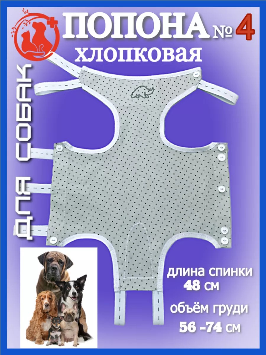 Попона для животных используется в после операционный период.Она является хорошей защитой от разлизывания раны животными и препятствием загрязнению шва. Попона крепится на шее и на туловище питомца с помощью эластичной перфорированной тесьмы ( резинки)и застегивается на пуговки. В таблице размеров указаны в объёме груди две цифры: первая-это ширина изделия без учета резинки,вторая-это ширина изделия с учетом резинки.Ткань - бязь,140 г/кв.м. , 100% хлопок, российская. Гигиеничность: этот материал хорошо пропускает воздух, гигроскопичен, гипоаллергенен.Не электризуется. Стирка при температуре 40-60 градусов. Фактура ткани гладкая, мягкая, приятная к телу.