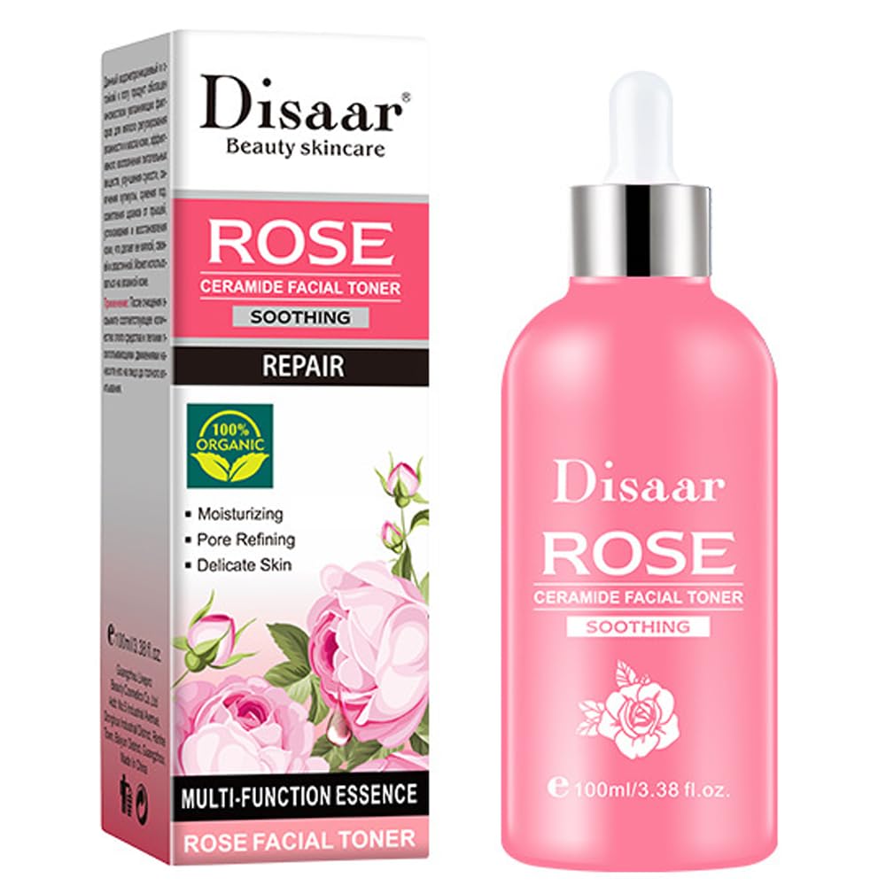 DISAAR BEAUTY Rose Ceramide Facial Toner – Moisturizing, Soothing Repairing Essence for Delicate Skin (100ml 3.38fl.oz) Reveal Calm, Hydrated, and Refined Skin with Nature's Gentle Touch Struggling with dryness, irritation, or visible pores? The DISAAR BEAUTY Rose Ceramide Facial Toner is your solution for achieving a balanced, supple complexion. Specially crafted for delicate and sensitive skin, this toner combines the nourishing power of rose extract and ceramides to moisturize, soothe, and repair your skin barrier while minimizing the appearance of pores. Key Benefits: Deep Hydration: Infuses skin with lasting moisture to combat dryness and flakiness. Soothes Sensitivity: Calms redness and irritation with gentle rose extract. Strengthens Skin Barrier: Ceramides reinforce your natural moisture barrier to protect against environmental stressors. Refines Pores: Lightweight formula helps tighten pores for a smoother, more even texture. Prepares for Skincare: Enhances absorption of serums and moisturizers for maximum efficacy. Why Rose Ceramides? Rose Extract: Rich in antioxidants, it tones, balances pH, and reduces redness for a radiant glow. Ceramides: Essential lipids that repair and protect the skin barrier, locking in hydration and preventing moisture loss. Hyaluronic Acid Botanical Extracts: Deliver lightweight hydration and promote a plump, dewy complexion. Ideal for Delicate Skin: Whether your skin is dry, sensitive, or prone to irritation, this alcohol-free, non-sticky toner is formulated to nurture without causing discomfort. It's the perfect first step to prep your skin for the rest of your routine. How to Use: After cleansing, apply a small amount to a cotton pad or palms. Gently press or swipe over face and neck, avoiding the eye area. Follow with your favorite serum and moisturizer for optimal results. Use morning and night for best results. Package Includes: 1x DISAAR BEAUTY Rose Ceramide Facial Toner (100ml 3.38fl.oz)