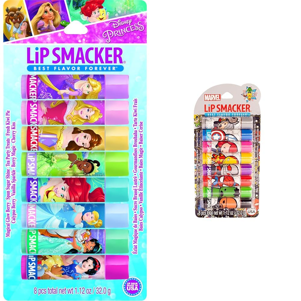 This fun and colorful 8-piece lip balm bundle packs a punch of moisture and flavor. It includes a Disney Princess-themed collection with 8 moisturizing lip balms in delicious fruit flavors that will make you smile. It also comes with a Marvel Avengers-inspired assortment with 8 lip balms featuring your favorite superheroes like Thor and Iron Man in heroic flavors. Both sets are cruelty-free and made in the USA. The Disney Princess lip balms provide soft, smooth lips with a soft shine finish. Scents like strawberry, blueberry and watermelon will transport you to a royal ball. Meanwhile, the Marvel superhero balms are perfect for fighting dry, chapped lips. With delicious smells of blue raspberry and cherry, these balms go on smooth like butter and leave lips wanting more. Plus, they create a pretty glossy finish for a spectacular smile. With a total of 16 lip balms, this bundle has something for everyone. Gift it for birthdays, holidays or stocking stuffers. Or keep all the flavors for yourself to discover new lip softening, smile-inducing flavor combinations. Let these playful and hydrating lip balms bring out your inner princess or tap into your superpowers. Your lips will thank you.