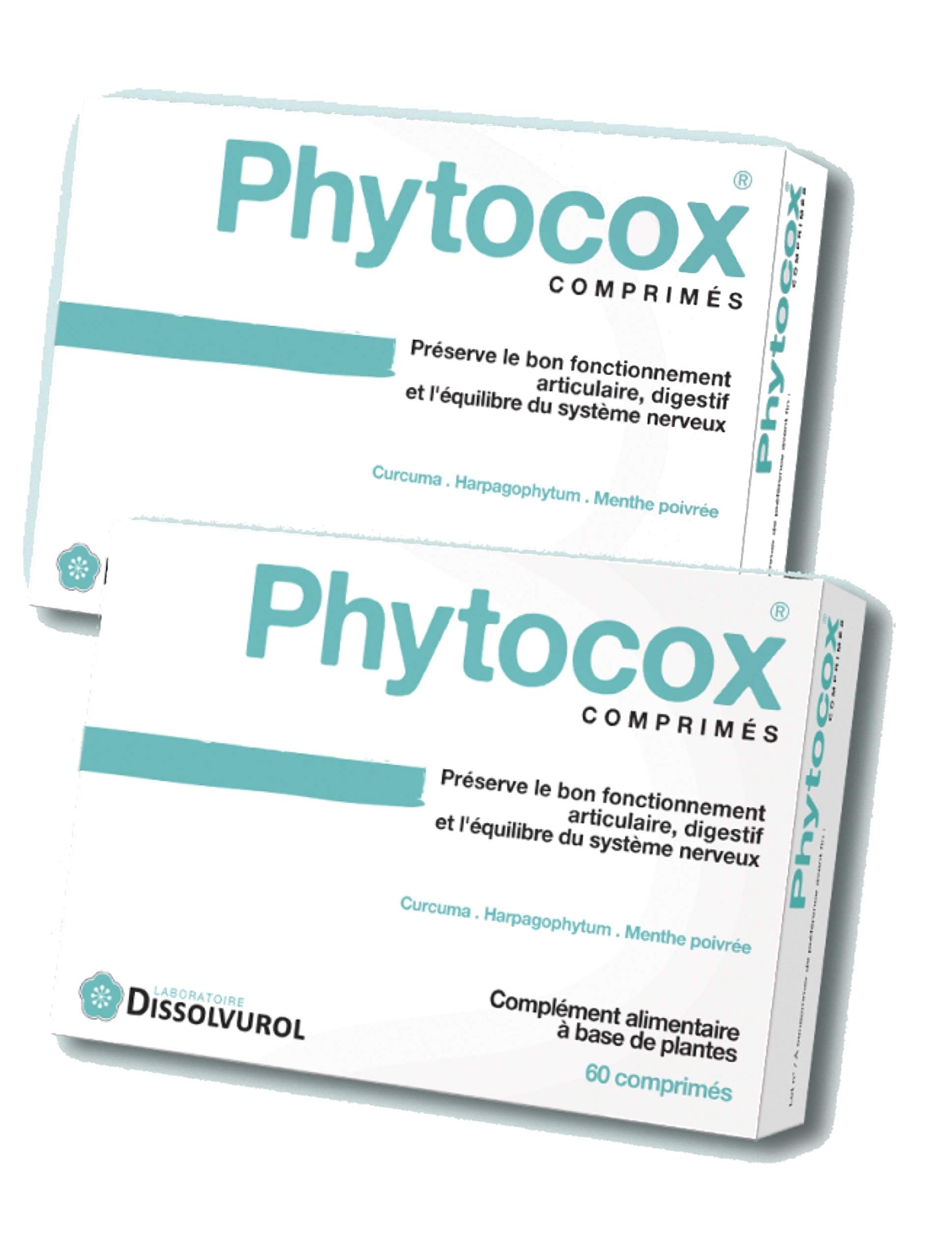 Temporary inflammation is an essential reaction of the body which defends itself against external (shock, injury, skin infection, etc.) and internal (cartilage damage, damaged organ, internal infection, etc.) attacks. Conversely, an inflammation that is discreet and localized initially but which continues can have harmful effects on other organs. It is scientifically proven that there is a link between inflammation at the nervous, digestive and joint levels. Properties of the ingredients The active ingredients in PHYTOCOX have been carefully selected to provide a global response helping to preserve joint and digestive comfort and nervous balance. INGREDIENTS Plant extracts: Dry extract and essential oil of Curcuma rhizome Curcugreen BCM (Curcuma longa), extract of Peppermint leaf (Mentha piperita), extract of Harpagophytum root (Harpagophytum procubens, H. zeyheri), essential oil of Peppermint (Mentha piperita) bulking agents: dicalcium phosphate, magnesium carbonate anti-caking agents: magnesium stearate coating: hydroxypropylmethylcellulose, stearic acid, microcrystalline cellulose. The naturalness of the ingredients and the desired absence of coloring may be the cause of color variations in the tablet. SAFETY WARNING The use of this food supplement should not replace a varied, balanced diet and a healthy lifestyle. Respect the recommended daily dose. Keep out of reach of young children. Due to the presence of essential oils of Mint and Turmeric, do not use in pregnant or breastfeeding women as well as in children and adolescents seek the advice of your doctor or pharmacist. In case of changes in liver function, gallstones or gallbladder stones, the use of the product is not recommended. Due to the presence of turmeric, this food supplement is not recommended for people taking anticoagulants. Store in a cool, dry place and away from light. The use of this food supplement should not replace a varied, balanced diet and a healthy lifestyle. Respect the recommended daily dose. Keep out of reach of young children. ? Directions for use: 1 tablet morning and noon. Swallow the tablet with a glass of water. ? The MINT leaf extract, reinforced by the addition of mint essential oil, has a recognized soothing effect on digestive discomfort. ? The HARPAGOPHYTUM root extract helps maintain healthy and flexible joints. ? The TURMERIC rhizome extract promotes joint comfort and nervous balance. L'inflammation passagère est une réaction indispensable de l'organisme qui se défend contre les agressions externes (choc, blessure, infection cutanée…) et internes (lésion d'un cartilage, organe en souffrance, infection interne…). A l'inverse, une inflammation discrète et localisée au départ mais qui se prolonge peut avoir des effets néfastes sur d'autres organes. Il est scientifiquement prouvé qu'il existe un lien entre inflammation aux niveaux nerveux, digestif et articulaire. Propriétés des ingrédients Les actifs de PHYTOCOX ont été soigneusement sélectionnés pour apporter une réponse globale contribuant à préserver le confort articulaire, digestif et l'équilibre nerveux. INGRÉDIENTS Extraits végétaux : Extrait sec et huile essentielle de Curcuma rhizome Curcugreen BCM (Curcuma longa), extrait de Menthe poivrée feuille (Mentha piperita), extrait d'Harpagophytum racine (Harpagophytum procubens, H. zeyheri), huile essentielle de Menthe poivrée (Mentha piperita) agents de charge : phosphate dicalcique, carbonate de magnésium anti-agglomérants : stéarate de magnésium enrobage : hydroxypropylméthylcellulose, acide stéarique, cellulose microcristalline. La naturalité des ingrédients et l'absence voulue de colorant peuvent être à l'origine de variations de couleurs du comprimé. AVERTISSEMENT DE SÛRETÉ L'utilisation de ce complément alimentaire ne doit pas se substituer à une alimentation variée, équilibrée et à un mode de vie sain. Respecter la dose journalière recommandée. Tenir hors de portée des jeunes enfants. En raison de la présence d'huiles essentielles de Menthe et de Curcuma, ne pas utiliser chez la femme enceinte ou allaitante ainsi que chez les enfants et les adolescents demandez l'avis de votre médecin ou pharmacien. En cas de modification de la fonction hépatique, de calculs biliaires ou de calculs vésiculaires, l'utilisation du produit n'est pas recommandée. En raison de la présence de curcuma, ce complément alimentaire est déconseillé chez les personnes sous anti-coagulant. À conserver au frais, au sec et à l'abri de la lumière. L'utilisation de ce complément alimentaire ne doit pas se substituer à une alimentation variée, équilibrée et à un mode de vie sain. Respecter la dose journalière recommandée. Tenir hors de portée des jeunes enfants. ? Conseil d'utilisation 1 comprimé matin et midi. Avaler le comprimé à l'aide d'un verre d'eau. ? L'extrait de feuilles de MENTHE, renforcé par l'adjonction d'huile essentielle de menthe, a un effet apaisant reconnu sur les gênes digestives. ? L'extrait de racines d'HARPAGOPHYTUM contribue à maintenir les articulations saines et flexibles. ? L'extrait de rhizomes de CURCUMA favorise le confort articulaire et l'équilibre nerveux.