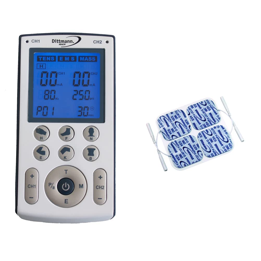Dittmann 3 in 1 Tens Massagegerät TEN250 TENS-EMS-Massage-Gerät für Schmerzbehandlung, Muskelstimulation und Massage Einfache anwenderfreundliche Tensanwendung durch Direktbuttons für Zubehör bzw. Körperzonen. Eine Timerfunktion und eine Display-Hintergrundbeleuchtung sorgen für zusätzlichen Komfort. 3 in 1 (Tens, EMS und Massage) 6 einfach anwendbare Direktbuttonfunktionen für Zubehör bzw. Körperzonen mit hinterlegten Anwendungsprogrammen 25 feste 11 einstellbare Tens-Anwendungsprogramme 11 feste 9 einstellbare EMS-Anwendungsprogramme 10 feste Massageprogramme 2 Kanäle mit einstellbarer Intensität und LED - Anzeige Timerfunktion Blaue Display-Hintergrundbeleuchtung Frequenzbereich von 2-150 Hz Impulsdauer von 50-350 µs Medizinprodukt - Dieses Produkt ist konform mit der Richtlinie 93 42 EWG über Medizinprodukte Lieferumfang 1 TENS EMS-Gerät 8 Klebeelektrodenpads 2 Verbindungskabel 1 Gebrauchsanweisung 4 x 1,5 Volt AAA Batterien Dittmann. Sport Klebeelektroden Original Dittmann., 4 x 4 cm Dittmann Original Sports Electrodes - 4 X 4 cm, White