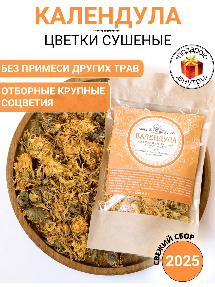 Calendula flowers have anti-inflammatory and antispasmodic properties. Tea made from marigold flowers reduces inflammation in the gastrointestinal tract and is used for inflammation of the oral mucosa and upper respiratory tract conditions (tonsillitis, pharyngitis, laryngitis). It also helps with urethritis and cystitis. It promotes relaxation of the smooth muscles of the stomach, small intestine, and colon, relieves spasms, and promotes normal gastrointestinal motility. An infusion of calendula flowers helps normalize the menstrual cycle and relieve painful spasms. It is used during menopause to improve well-being. Calendula tea also helps normalize the nervous system and is used for sleep disorders and neuroses. It is used as an adjunct in complex therapy for digestive disorders accompanied by inflammation of the bile ducts, impaired secretion and flow of bile, and is used for gastritis, gastric and duodenal ulcers, colitis, and liver diseases. It helps lower blood pressure and is used for hypertension. Brewing method: Take 1-2 teaspoons of calendula, pour 200 ml of boiling water over it, and let it steep for 30 minutes. Each package of herbal tea contains a small gift from our tea collection!