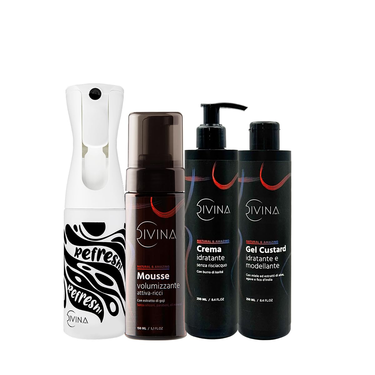 You can say goodbye to bad hair days and lusterless curls in the days after washing: a quick, ultra-moisturizing refresh to maintain soft, disciplined curls and give them the same volume, elasticity and definition as after washing - and to stimulate and bond your curly hair, wherever you are, even on the most stressful days. Paraben free, sulfate free, mineral oil free.Custard Moisture and Modeling Gel: It is long lasting, gives styling ultra definition and elasticity and keeps hair moisturized and protected. Active Curly Volumizing Mouse: light and easy to apply, makes styling visibly more voluminous and ultra-light. Leave-in Moisturizing Cream: without rinsing, keeps curly hair soft for a long time and naturally hydrates and protects it. Refresher spray bottle: gently and evenly sprays the water, covering the entire volume of the curls without wetting them. Leave-in treatment for daily refreshment of curly hair, stimulates and defines styling.DIVINA BLK Kit - Definitie Refresh voor golvend, krullend, superkrullend, Afro-haar Natural Amazing Je kunt je afscheid nemen van bad-hair-days en glanzenloze krullen in de dagen na het wassen: een snelle, ultra-hydraterende verfrissing om zachte, gedisciplineerde krullen te behouden en ze hetzelfde volume, dezelfde elasticiteit en dezelfde definitie te geven als na het wassen - en om je krullend haar te stimuleren en te binden, waar je ook bent, zelfs op de nog zo stressvolle dagen. Parabenvrij, sulfaatvrij, minerale olievrij.Custard vocht- en modelleergel: Het is duurzaam, geeft de styling ultra definitie en elasticiteit en houdt het haar van vocht en beschermd. Active Curly Volumizing Mouse: licht en eenvoudig aan te brengen, maakt de styling zichtbaar volumineuzer en ultralicht. Leave-in Moisturising Cream: zonder uitspoelen, houdt krullend haar lang zacht en hydrateert en beschermt het natuurlijk. Refresher-sproeifles: verstuift zacht en gelijkmatig het water en bedekt het gehele volume van de krullen zonder ze te bevochtigen. Leave-in-kuur voor de dagelijkse verfrissing van krullend haar, stimuleert en definieert de styling.