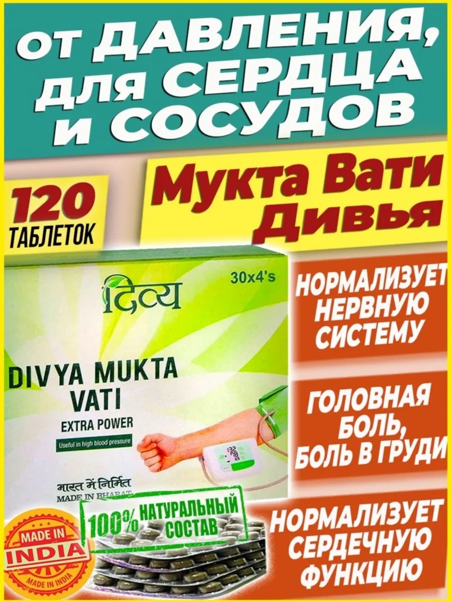 | Форма выпуска | индийские таблетки Mukta Vati Divya; травяной сбор Мукта Вати Дивья от давления; натуральный растительный состав - вегетарианский продукт из Индии |