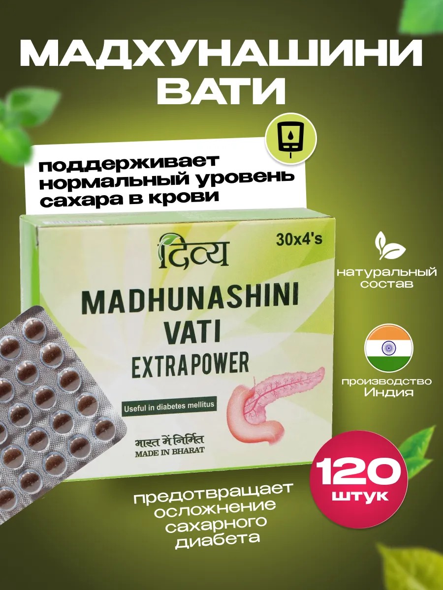 Madhunashini Vati ("sweetness destroyer") is a herbal and mineral supplement with antidiabetic, cardioprotective, neuroprotective, adaptogenic, and immunomodulatory properties, designed to reduce the severity of diabetes-related dysfunction and prevent its complications. It tones and strengthens the immune system, detoxifies the body, removing accumulated harmful substances, and accelerates tissue regeneration. Taking Madhunashini Vati normalizes blood glucose levels in diabetes. It suppresses glucose absorption and appetite, changes the appetite for sweets, normalizes pancreatic health and insulin production, and accelerates the conversion of glucose to glycogen. It also optimizes weight. The drug gradually reduces the frequent urge to urinate in diabetes, eliminates dry mouth, constant hunger and thirst, apathy and exhaustion, numbness of the extremities, tingling, stops the decrease in visual acuity, prevents the development of infections of the urinary tract and skin. The drug is very useful for the nervous system, it increases energy tone, normalizes the psycho-emotional state, eliminates neurasthenia, irritability, and improves mental endurance. The drug can be taken for a long time in both acute and chronic diseases, but lifelong use is not required. It is not addictive, has no side effects. Over time, it allows you to reduce the initial dose of conventional medications and insulin, and then stop taking them altogether. Indications for use: diabetes mellitus types 1 and 2; disorders of the pancreas; slagging of the body; low immunity; infectious diseases of the urinary tract; numbness of the extremities; skin diseases; Neurasthenia, apathy, irritability. Directions: Take 1-2 tablets twice daily, 1 hour before or after meals, with warm water or milk, for a minimum of 40 days. If taking other allopathic medications or insulin concurrently, glucose levels should be measured 2 weeks after starting a course of Madhunashini. If blood sugar levels stabilize, allopathic medications should be reduced or discontinued after consultation with a specialist. Upon completion of the course and if glucose levels remain acceptable, Madhunashini Vati should be reduced or discontinued. Contraindications: Individual intolerance to any of the ingredients. This is not a medicine.