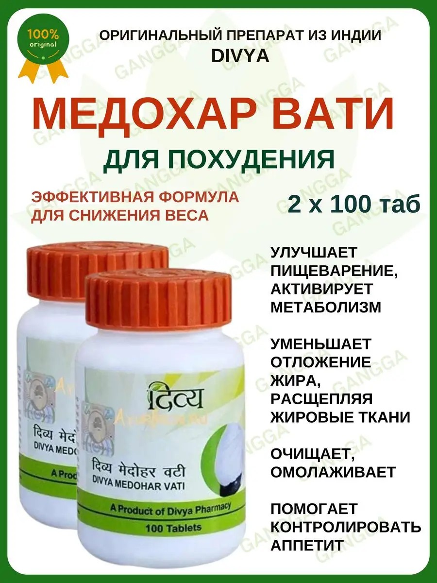 Divya Медохар Вати, Medohar Vati, для похудения, Дивья, 2х100 таб