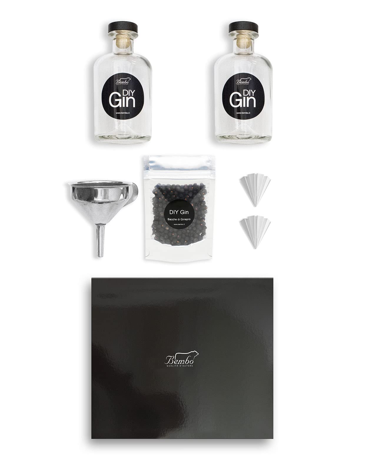 Add the chosen botanicals to the vodka along with the juniper and let it macerate for 24 hours. After this time, your drink will have taken on an amber color. Strain to remove any residue and refill your gin. Don't forget to apply the label on which you note the spent botanicals. Your personal gin is ready to drink: keep it in the dark and serve it chilled. 750 ml of 40-proof neutral spirit (not included in the delivery, e.g. vodka). Add a few juniper berries (8 10 berries). Let the berries macerate for 24 hours in the dark. Delivery contents: two glass bottles of gin (350 ml each), juniper berries (35 g), two filters, a funnel, labels to personalize the bottles. Create endless flavor combinations by adding the "Do It Yourself Gin" set to the Bembo botanical assortments. Immerse yourself in the atmosphere of the screening and produce your own gin at home with a botanical recipe designed by you: unique and irreplaceable.Ajoutez les botaniques choisies à la vodka avec le genévrier et laissez macérer le tout 24 heures. Au fil de ce temps, votre boisson aura pris une couleur ambrée. Filtrez pour éliminer les résidus et remplissez votre gin. N'oubliez pas d'appliquer l'étiquette sur laquelle vous prenez note des botaniques usées. Votre gin personnel est prêt à être buvé : gardez-le dans l'obscurité et servez-le frais. 750 ml d'alcool neutre à 40 degrés (non inclus dans la livraison, par exemple la vodka). Mettez quelques baies de genévrier (8 10 baiques). Laissez macérer les baies pendant 24 heures dans l'obscurité. Contenu de la livraison : deux bouteilles en verre de Gin (350 ml chacune), baies de genévrier (35 g), deux filtres, un entonnoir, étiquettes pour personnaliser les bouteilles. Créez des combinaisons infinies d'arômes en ajoutant le lot « Do It Yourself Gin » aux assortiments de botaniques Bembo. Calculez-vous dans l'atmosphère de la projection et produisez votre gin chez vous avec une recette de botaniques conçue par vous : unique et irremplaçable.