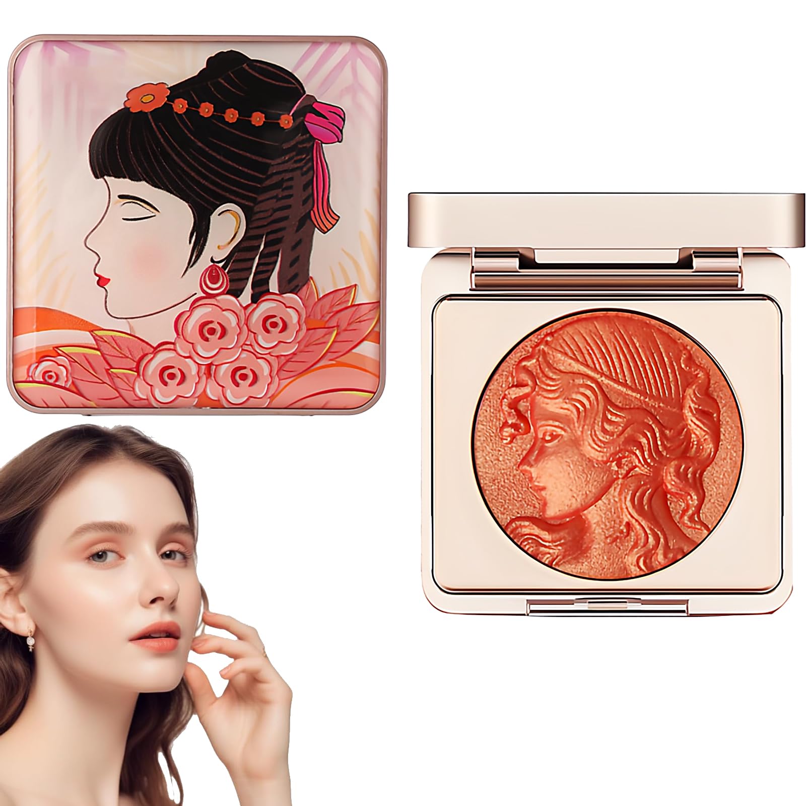 Versatile: This blush is beautiful and easy to pigment. You can use it alone or layer it with other colors. It can also be used as eyeshadow to add a natural glow to your face. Powder Blush includes a variety of color options for every skin tone, from soft pinks to warm oranges. The shades are easy to blend and coordinate with different skin tones. Natural Look: Suitable for all skin types, our powder blush contains finely milled powder. Lightly apply the palette with a soft brush and sweep it across your cheeks for a youthful glow. You'll experience effortless application and a perfect finish every time. Luminous: Our blush contains fine shimmering particles that create a luminous glow on your cheeks for a natural, light-catching hue for an ethereal look. Cream Blush contains finely milled powder that glides smoothly onto the skin and blends seamlessly to accentuate cheekbones and add extra dimension to your face. Embossed Design: This blush features a delicate embossed design with a vibrant girl engraved on it, adding an elegant touch. The attractively designed cream blush combines aesthetics and functionality to create a beautiful and practical product that makes a stylish addition to your cosmetics collection. High-Quality Ingredients: Made with premium ingredients, our peach blush has a fine texture, high pigmentation, and easy application to help you achieve a rosier look. The blush formula is water-resistant and long-lasting, providing flawless color payoff without fading and staying put for a long time, adding a natural radiance to your face.