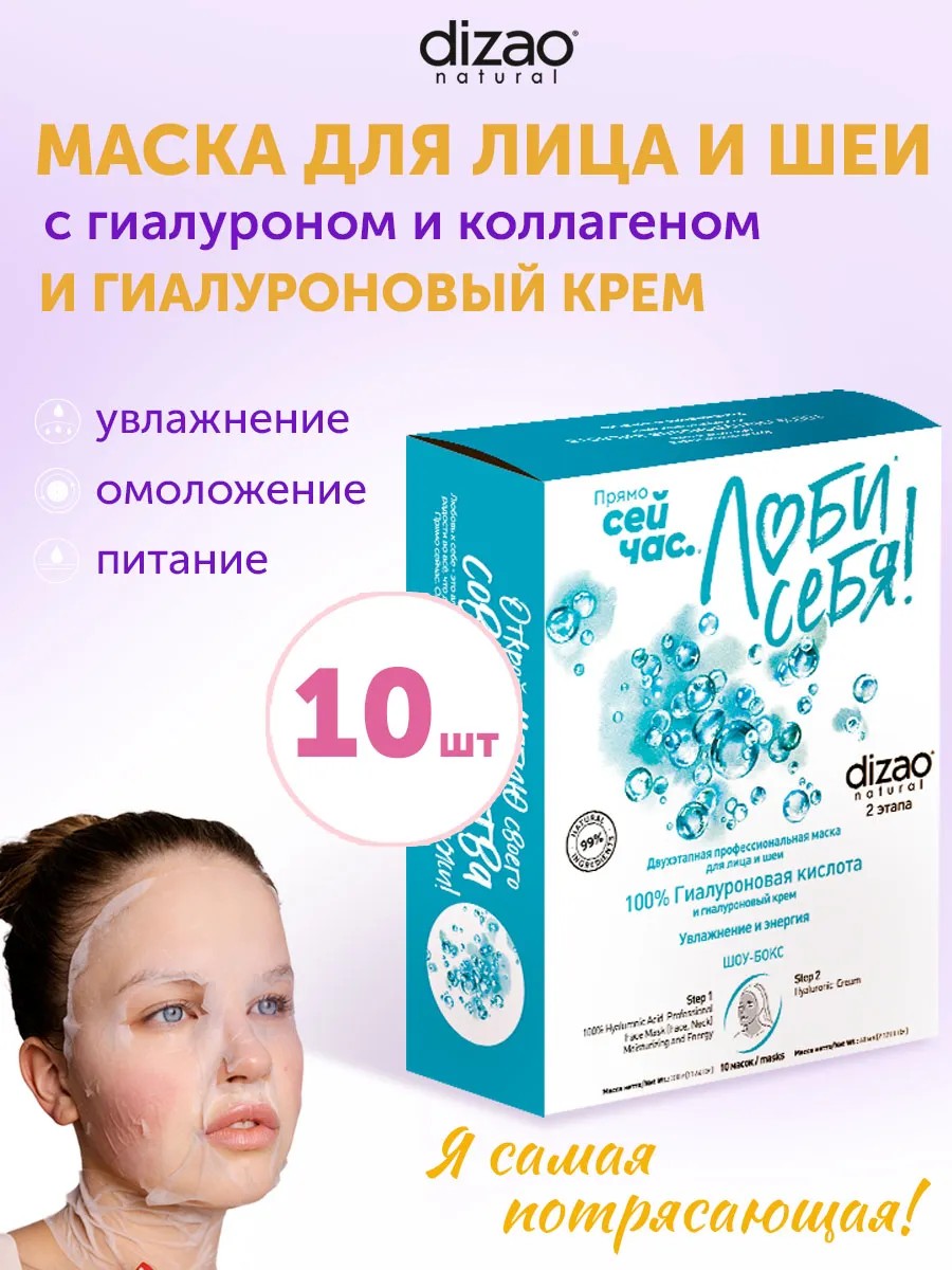 Dizao Маска для лица и шеи с гиалуроном и коллагеном 10 шт+крем