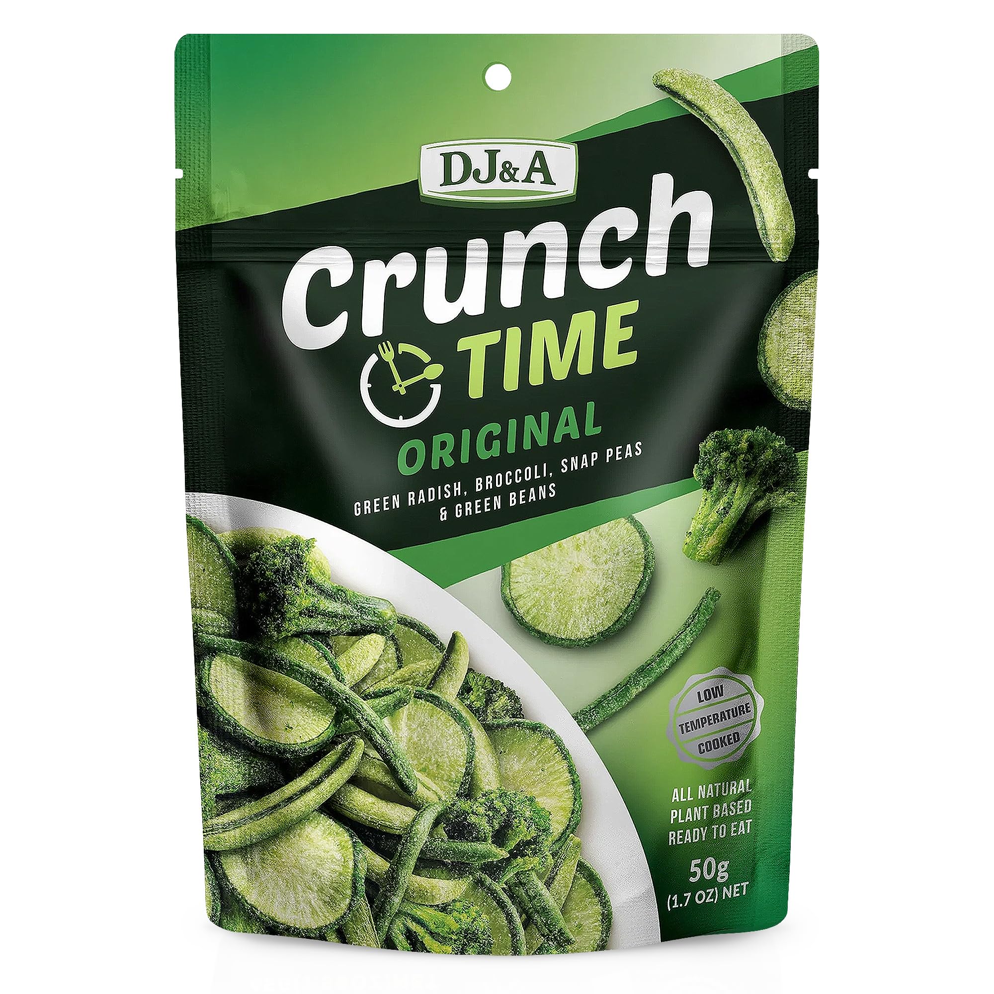 The perfect way to give your greens a crunchy boost! One 50g bag is made from 140 grams of raw vegetables, making it naturally nutrient-dense. It's also all-natural, plant-based, halal, kosher, and a good source of dietary fiber. It contains no GMO ingredients, no added MSG, and no artificial colors, flavors, or preservatives. Our green radishes, broccoli, snow peas, and green beans are cooked to perfection so they're light and crisp and flavored with the most delicious seasoning. Get your crunchy fix! Ingredients: Vegetables (73 ) (green radish, broccoli, snow peas, green beans), vegetable oils, maltose, seasoning (maltodextrin, salt, yeast extract, natural flavoring, spices, vegetable powder (onion, garlic), sunflower oil, turmeric). Order a pack of these healthy snacks today.DJ A Crunch Time Original 9 x 50 gDESCRIPTION DU PRODUIT Le moyen idéal pour mettre vos légumes verts dans un temps crunch! Un sac de 50 g est fabriqué à partir de 140 grammes de légumes crus, ce qui le rend naturellement dense en nutriments Il est également entièrement naturel, à base de plantes, halal, casher et une bonne source de fibres alimentaires. Il ne contient pas d'ingrédients OGM, sans glutamate ajouté, ni colorants, arômes ou conservateurs artificiels. Nos radis verts, brocoli, pois mange-tout et haricots verts sont cuits à la perfection afin qu'ils soient légers et croquants et aromatisés avec l'assaisonnement le plus délicieux. Faites-vous craquer! Ingrédients : légumes (73 ) (radis vert, brocoli, pois mange-tout, haricot vert), huiles végétales, maltose, assaisonnement (maltodextrine, sel, extrait de levure, arôme naturel, épices, poudre végétale (oignon, ail), huile de tournesol, curcuma). Commandez un lot de ces collations saines dès aujourd'hui.