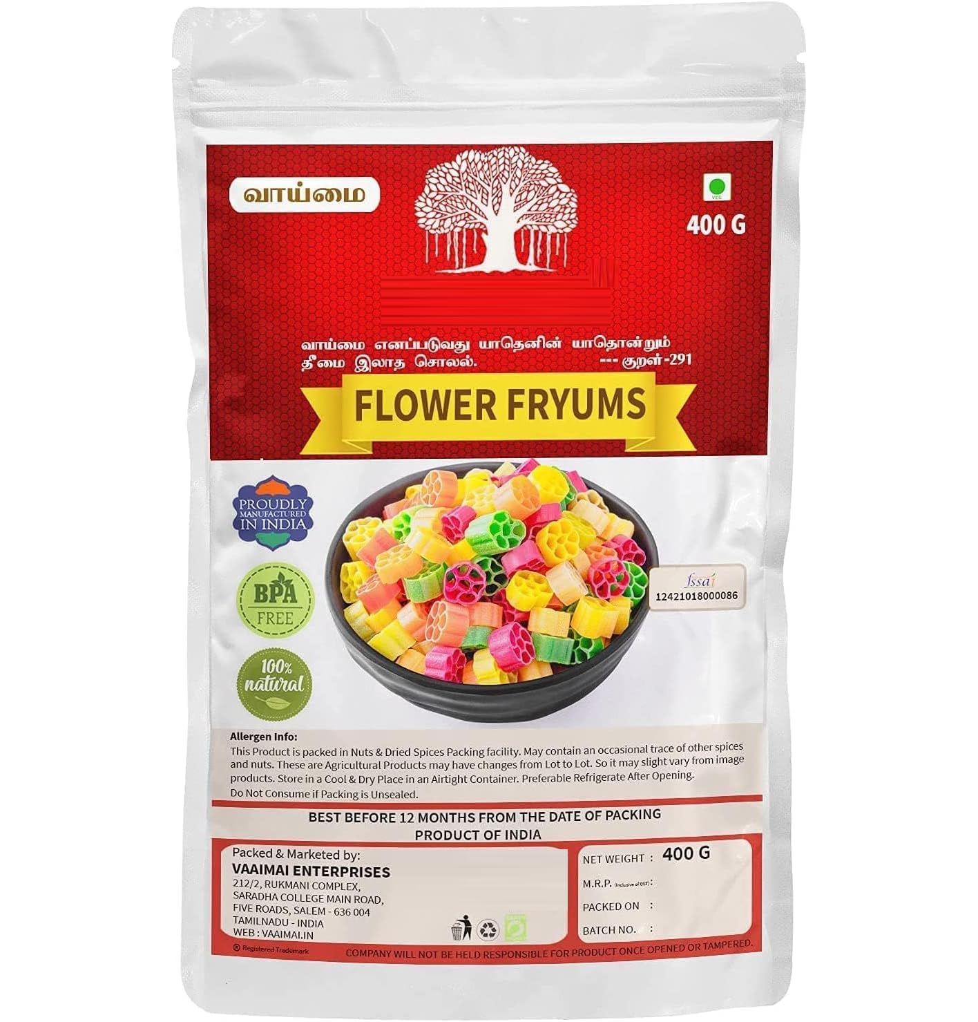 DESCRIPTION DU PRODUIT Friteuses colorées en forme de fleur - Croustillantes prêtes à frire - Friteuses crues faites maison. Elles sont communément appelées frryums parce que c'est exactement ce que vous faites pour celles-ci, vous les faites frire dans de l'huile chaude pendant environ 5 secondes. Ils s'élargissent d'environ 2 à 4 fois leur taille non cuite. Un mélange de farine, le tapioca lui donne une saveur et une texture très uniques. Vous pouvez les assaisonner avec du masala ou votre mélange préféré, même du sel et du poivre.