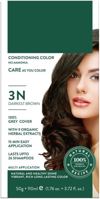 : Revitalizing Hair Color Ammonia-Free Hair Color with 9 Organic Plant Extracts Provides Natural, Healthy Shine Long-Lasting Color Dark Brown 3N 50g 110ml (Pack of 1) Achieve rich, long-lasting color and intense nourishment with this revitalizing hair color – Dark Brown 3N. Specially formulated with 9 organic plant extracts, this ammonia-free hair color gently colors your hair while deeply conditioning it. The result? Beautiful, shiny, and healthy-looking hair, without harsh chemicals. This easy-to-use kit includes everything you need for full gray and vibrant color coverage in just one application. Ingredients: 9 organic plant extracts. Instructions: Divide hair into 4 sections – Start application at the front of the head and work through the hair. Gather hair into 1 4-inch parts and gently distribute the color with your fingers. Set the timer for 15 to 20 minutes. After rinsing, rinse your hair under warm water until the water runs clear. Apply conditioner and rinse thoroughly. Safety warning: For external use only.Ingredients: 9 organic plant extracts. Our hair color takes only 15 minutes. Simply section your hair into four parts and apply the color. Gently distribute the color evenly with your fingers and rinse with warm water after 15-20 minutes. OURBio Herbcolor Revitalizing Hair Color is made with 100 natural botanical extracts and is free of harmful chemicals. It is dermatologically tested, recommended for all hair types, and safe for regular use. Key substances: This herbal hair color contains six organic plant extracts, including black tea, hibiscus, and shikakai, which are carefully selected natural substances to protect and nourish your hair and scalp while intensifying your hair color. What it is: This advanced cream hair color system combines the cleanest pigments and healthiest plants grown in the Himalayas with cutting-edge technology. Our Herbcolor hair color adds shine and softness to hair all day long. Hair looks beautiful and healthy thanks to our plant-based formula. Multiple applications of hair color provide a healthy, natural shine that makes hair glossy. It lasts up to 26 washes and completely covers gray hair.DK Coloration revitalisante pour cheveux sans ammoniaque avec 9 extraits de plantes biologiques Fournit une brillance naturelle et saine Couleur durable Brun foncé 3N 50 g 110 ml (lot de 1)DESCRIPTION DU PRODUIT Description du produit : Coloration revitalisante pour cheveux Coloration capillaire sans ammoniaque avec 9 extraits de plantes biologiques Fournit une brillance naturelle et saine Couleur longue durée Brun foncé 3N 50 g 110 ml (lot de 1) Obtenez une couleur riche et durable et une nutrition intense avec cette coloration revitalisante – Marron foncé 3N. Spécialement formulée avec 9 extraits de plantes biologiques, cette coloration sans ammoniaque colore doucement vos cheveux tout en les revitalisant en profondeur. Le résultat ? Cheveux beaux, brillants et sains, sans produits chimiques agressifs. Ce kit facile à utiliser comprend tout ce dont vous avez besoin pour une couverture complète des gris et des couleurs vives en une seule application. Ingrédients : 9 extraits de plantes biologiques. Instructions : répartissez les cheveux en 4 sections - Commencez l'application à l'avant de la tête et travaillez à travers les cheveux. Ramassez les cheveux en raies de 1 4 de pouce et répartissez doucement la couleur avec les doigts. Réglez la minuterie pendant 15 à 20 minutes, après ce rinçage, sortez de vos cheveux sous l'eau chaude jusqu'à ce que l'eau soit claire. Appliquez l'après-shampoing et rincez bien. Avertissement de sécurité pour une utilisation externe uniquement.Ingrédients : les 9 extraits de plantes biologiques. Notre coloration de cheveux ne prend que 15 minutes. Il suffit de couper les cheveux en quatre parties et d'appliquer la couleur. Répartissez délicatement la couleur uniformément avec vos doigts et rincez à l'eau chaude après 15 20 minutes. La coloration revitalisante OURBio Herbcolor est fabriquée avec des extraits botaniques 100 naturels et est exempte de produits chimiques nocifs. Il est testé dermatologiquement, recommandé pour tous les types de cheveux, et sans danger pour une utilisation régulière. Substances clés : cette coloration à base de plantes contient six extraits de plantes biologiques, y compris le thé noir, l'hibiscus et le shikakai, qui sont des substances naturelles soigneusement choisies pour protéger et nourrir vos cheveux et votre cuir chevelu tout en intensifiant la couleur de vos cheveux. Ce que c'est : ce système de coloration crème de pointe combine les pigments les plus propres et les plantes les plus saines cultivées dans l'Himalaya avec une technologie de pointe. Notre couleur Herbcolor ajoute de la brillance et de la douceur aux cheveux toute la journée. Les cheveux sont beaux et sains grâce à notre coloration à base de plantes. Plusieurs applications de couleur de cheveux offrent un éclat sain et naturel qui rend les cheveux brillants. Il dure jusqu'à 26 lavages et cache complètement les cheveux gris.
