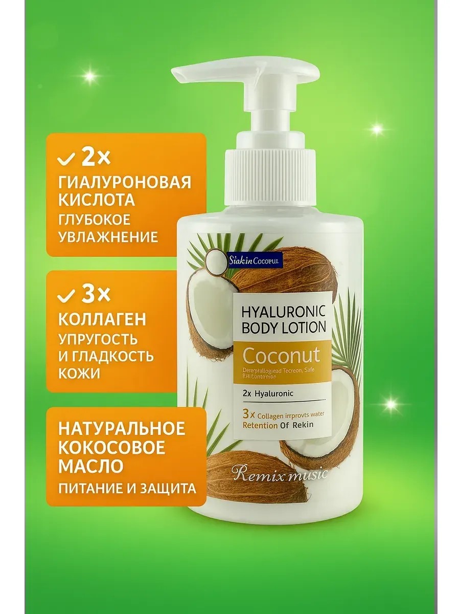 Фруктовое увлажняющее молочко для тела с кокосом Remix Music — эффективный уход для тела, рук и ног. Формула с 2× гиалуроновой кислотой и 3× коллагеном глубоко увлажняет, питает и восстанавливает кожу, делая её мягкой, гладкой и упругой. Лёгкая текстура быстро впитывается, не оставляя липкости. Нежный аромат кокоса сохраняется до 24 часов. Подходит для всех типов кожи, безопасно для чувствительной. Удобный флакон с дозатором 300 мл обеспечивает экономичный расход.