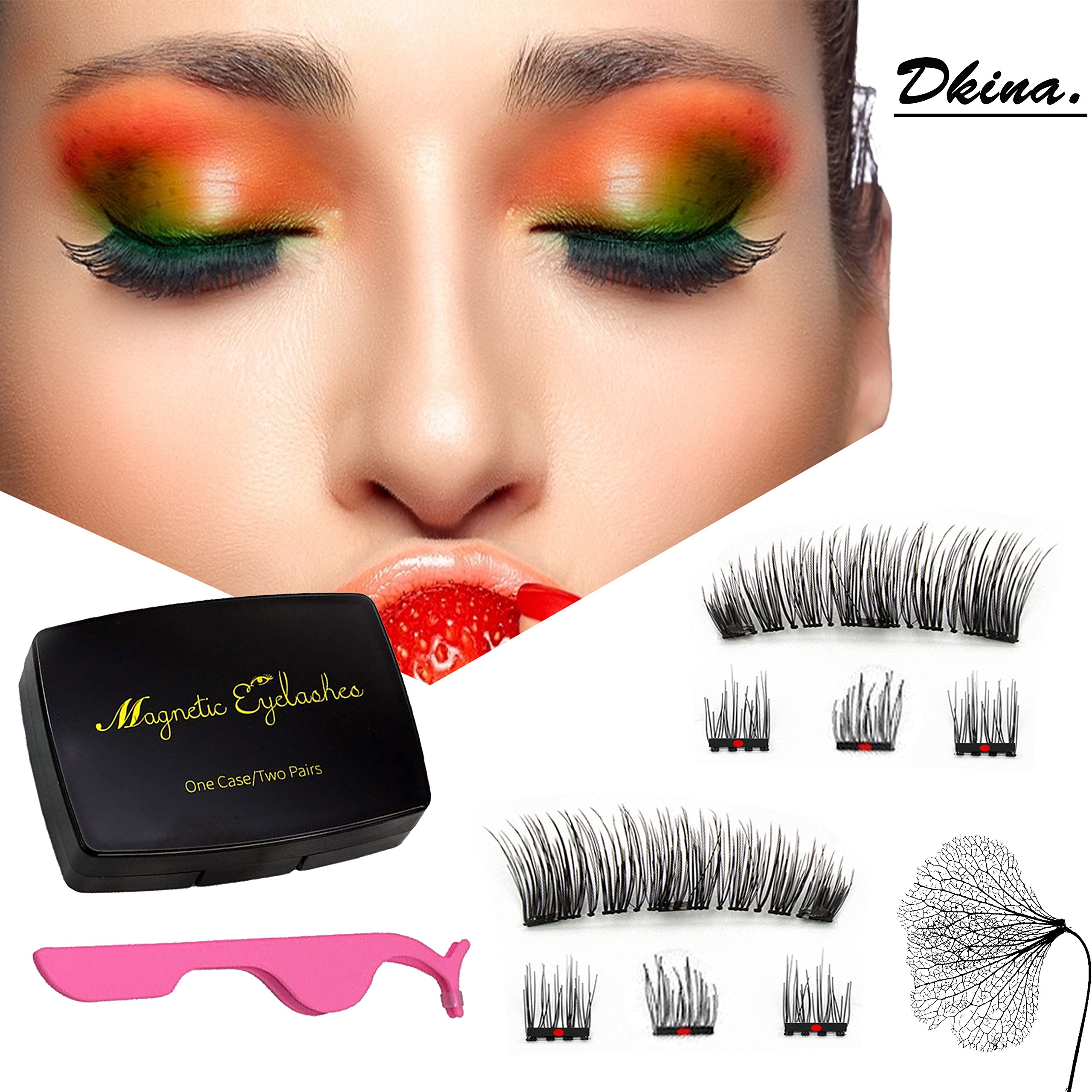 Dkina Magnetische Wimpern,3D Künstliche Wimpern Magnet Wimpern Set Wiederverwendbare magneten Wimpern mit 3 magneten natürliches Aussehen +Edelstahl Pinzette (1 Paar 8 Stück)