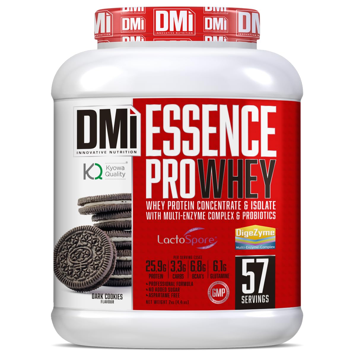 DMI Essence Pro Whey. Bocal blanc avec étiquette rouge. Les détails incluent 25 g de protéines, 57 portions et saveur de biscuits noirs
