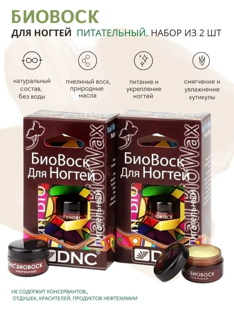 Набор из 2 шт. Биовоск Питательный. Полностью натуральное средство для защиты, питания и восстановления ногтей, а также для ухода за кутикулой. Если ваши ногти потеряли свой естественный матовый блеск - значит, вы столкнулись с так называемой усталостью ногтей, причиной которой помимо вредных воздействий служит недостаток необходимых ногтям питательных веществ. Вернуть ногтям блеск и прозрачность, а также обеспечить их необходимым уходом, поможет тщательно подобранная композиция многоуровневого действия. Касторовое масло, входящее в состав БиоВоска, обеспечивает ногти необходимыми питательными веществами, способствует смягчению кутикул и заживлению ранок. Воск для ногтей и кутикулы легко оценить с первого же применения, действовать он начинает моментально. Сразу после нанесения кутикулы приобретают аккуратный и ухоженный вид. / Применение: Массирующими движениями втереть воск в ногти и кожу вокруг них. смывать не нужно. Подходит для процедуры запечатывания ногтей. С 2021г производится в новом дизайне (темная баночка). / Состав Биовоск для ногтей Питательный: Castor Oil (Касторовое Масло), Beeswax (Пчелиный Воск), Citrus Aurantium Dulcis Oil (Апельсиновое Масло) Eleutherococcus Senticosus (Экстракт Элеутерококка), Ginseng Extract (Экстракт Женьшеня), Tocopheryl Acetate (Витамин Е), Hippophae Rhamnoides Pulp Oil (Экстракт Облепихи), Eugenia Caryophyllata (Масло Гвоздики), Santalum Album Oil (Масло Сандала), Ylang-Ylang Oil (Масло Иланг-Иланг).