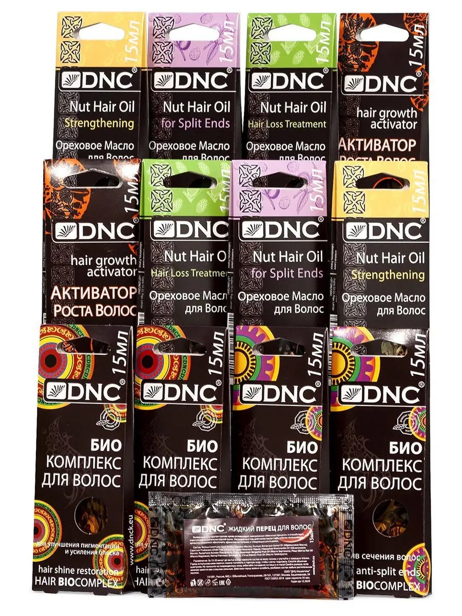 | Package Contents | Gift (Liquid pepper for hair 15 ml) - 1 pc; oil Biocomplex mask Against split ends (15 ml) - 2 pcs; oil Biocomplex To improve pigmentation and enhance shine of hair (15 ml) - 2 pcs; Hair growth activator complex of oils For thin and colored hair (15 ml) - 2 pcs; Walnut oil Against hair loss Nourishing (15 ml) - 2 pcs; Walnut oil Against split ends Restorative (15 ml) - 2 pcs |