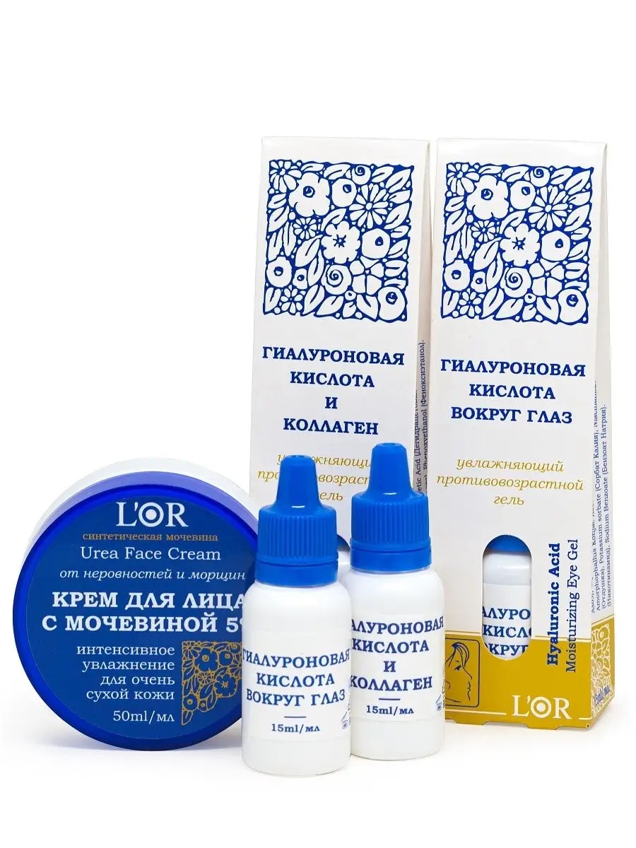 | Package Contents | Cream for dry skin with urea 5% 50 ml - 1 pc; hyaluronic acid gel for the skin around the eyes 15 ml - 1 pc; hyaluronic acid and collagen gel 15 ml - 1 pc. |