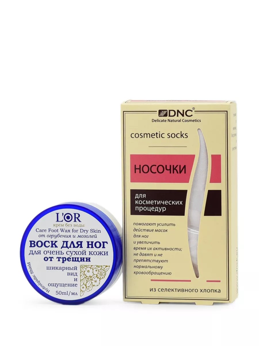 В наборе крем воск для очень сухой кожи от трещин и косметические хлопковые носочки 1 пара. Воск для ног для очень сухой кожи от трещин - плотный концентрированный безводный крем-маска для интенсивного ухода за ступнями. Оживляет и восстанавливает усталую кожу. Отлично заполняет неровности и трещинки, создавая наилучшую среду для естественной регенерации. Крем-воск можно применять ежедневно, как защитное и восстанавливающее средство. Наиболее эффективно он работает в качестве маски для ног в паре с косметическими носочками. Чистую кожу стоп обильно смажьте крем-воском, наденьте косметические носочки или п/э бахилы. Можно использовать пакеты или пищевую пленку. Если Вы воспользовались бахилами, то снимите их через пару часов. Под косметическими носочками маску рекомендуем оставить на ночь. При необходимости, удалите остатки крем-воска бумажной салфеткой. Если на стопах есть сильно загрубевшие участки, натоптыши, то (при отсутствии противопоказаний) можно раз в 2-3 недели перед нанесением маски обрабатывать их мелкоабразивной пилкой по сухой, не распаренной коже. Водите пилкой в одном направлении, чтобы кожа стоп не стала шершавой. После обработки сделайте ванночку для ног ополосните промокните воду полотенцем и нанесите крем-воск. Рекомендуем дополнить уход кремом DNC для ног с 15 процентами мочевины.