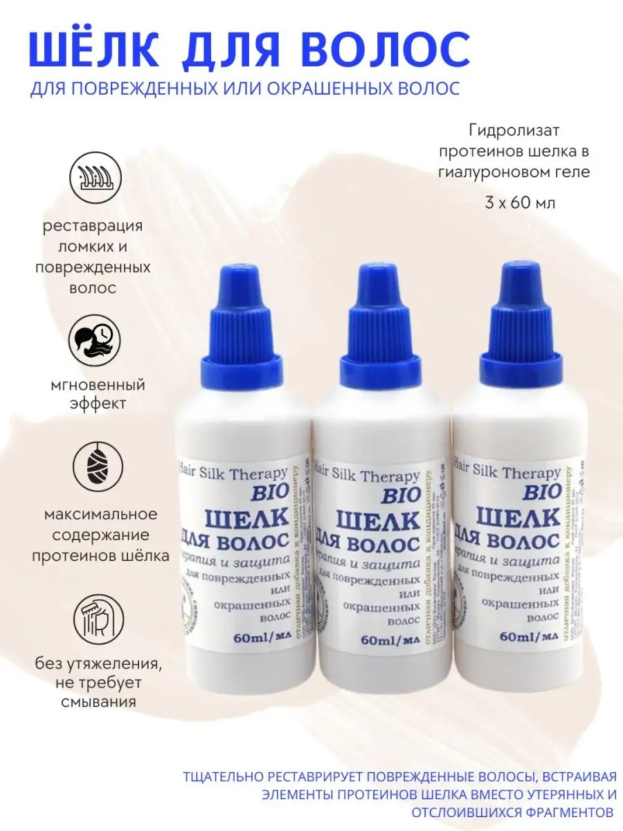 The set includes 3 bottles of 60 ml each. Silk protein hydrolysate - beauty and protection for weak and damaged hair, interacting with the damaged structure, restores and protects it. Very close to natural hair tissue, it adds softness, elasticity, and a healthy shine. An excellent product for maintaining the color of colored hair. Promotes deep and long-lasting hydration of the scalp. Silk for hair contains proteins and plant extracts in a hyaluronic acid gel. The product thoroughly restores damaged hair, embedding silk protein elements in place of lost and exfoliated fragments. Does not weigh hair down or reduce its elasticity. Especially recommended for curly hair. Application: Silk can be used before or after washing, as a leave-in treatment or as a hair mask, alone, or mixed with your conditioner before application. Distribute over the lengths of the hair. Rinse, if necessary, after at least 20 minutes. Condition, dry, and style as usual. Apply 1-2 times a week. Ingredients: Aqua, Hydrolyzed Silk, Urticae Extract, Citrus Limonium Peel Extract, Plantain Leaf Extract, Betula Pendula Extract, Leuconostoc/Radish Root Ferment Filtrate, Carbomer, Hyaluronic Acid, Panthenol.