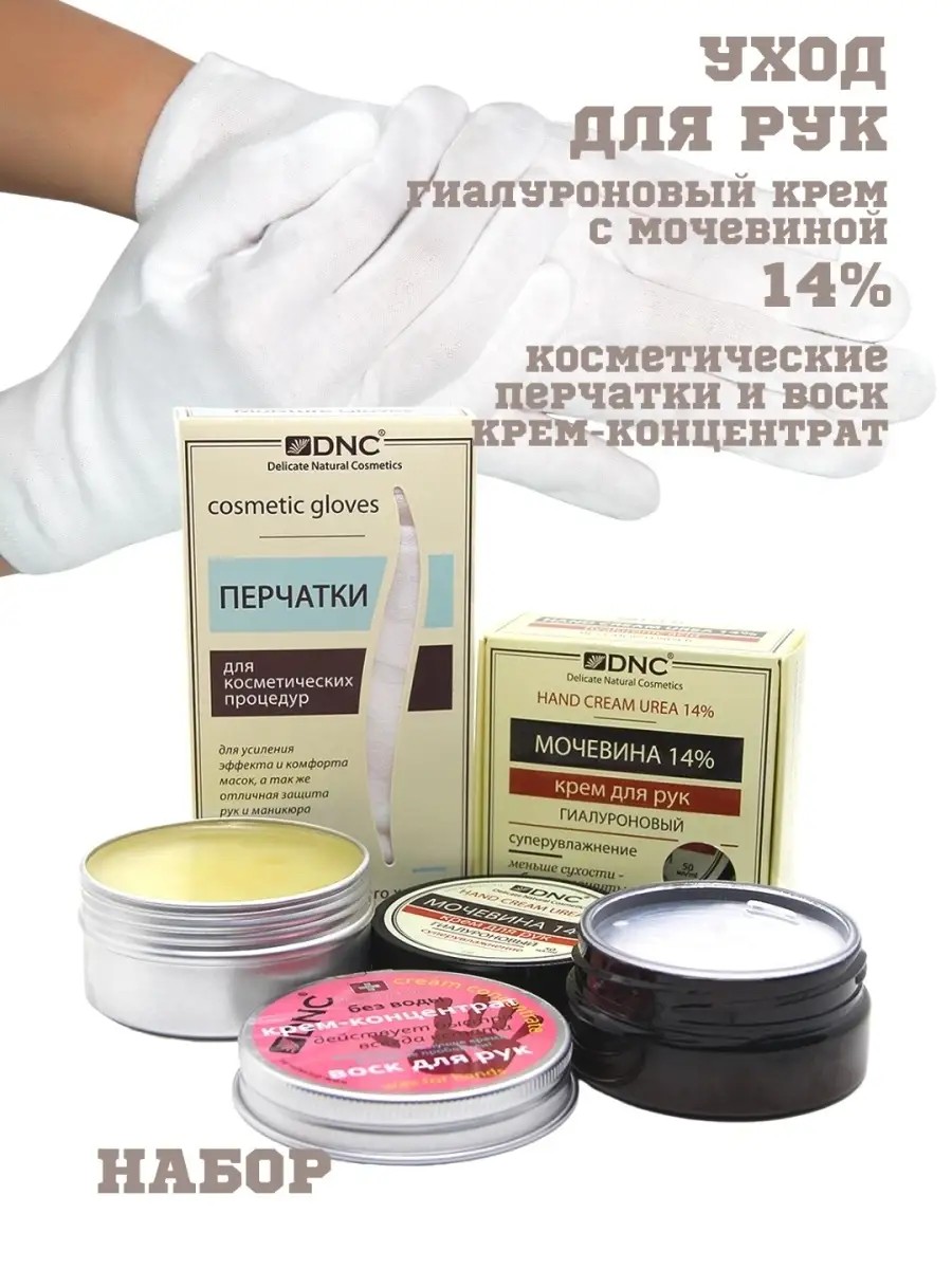 DNC Набор для рук: крем гиалуроновый мочевина 14%, воск для рук, перчатки х/б (50мл, 80мл, 1пара)