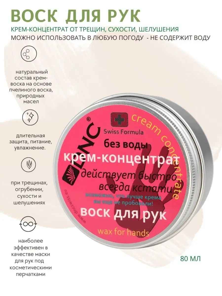 A dense, concentrated hand and nail care cream. Free of mineral oils, preservatives, dyes, fragrances, etc. Acts immediately and effectively on even the most severe skin conditions—cracks, roughness, dryness, and flaking. Contains only active natural ingredients. Ideal for protecting skin even in the harshest conditions. Water-free and suitable for use at any temperature. A completely natural product. Contains only oils, beeswax, and the highest-quality plant extracts. Effective hydration. Maximum nourishment. Works well as an overnight treatment when used with cosmetic gloves. Effectively eliminates microcracks and stimulates skin regeneration, leaving skin soft and supple. Economical use. Volume: 80 ml. Packaging - a jar with a screw cap. / Composition Cream-concentrate "Hand wax": Olive Oil (Olive Oil), Cera Alba (Beeswax), Theobroma Cacao Butter (Cocoa Butter), Chamomile Oil (Chamomile Oil), Cupressus sempervirens Oil (Cypress Oil), Tocopherol (Vitamin E).